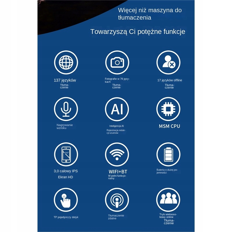 Ми представляємо останню модель електронного перекладача Chipol Z9p у липні 2024 року, яка пропонує надійні та вдосконалені функції в елегантному та компактному розмірі. Завдяки вашій універсальності та продуктивності ви можете насолоджуватися рідкими та точними перекладами в різних ситуаціях. Польський Інтернет не потрібен !! Завдяки цьому ви можете вільно говорити на 137 мовах та їх варіантам, незалежно від того, де ви знаходитесь. Зараз подорож стала набагато захоплюючою! Незалежно від того, чи це розмова чи фотографія, цей перекладач ідеально виконає це завдання. Це революційне рішення! Перекладач, кожна розмова іноземною мовою проста і проста. Все, що вам потрібно зробити, - це говорити, і перекладач автоматично перекладе ваші слова і вголоси вголос переклад у вашому виборі. Обмеження. Завдяки двом ґудзикам - зеленим та червоним - це дуже інтуїтивно. Цей двосторонній переклад може перекласти ваші слова на іноземну мову або ваші заяви іноземною мовою в польську мову. В'єтнам. Завдяки високій якості розпізнавання мови та ідіоми та спеціалізованої лексики ви можете надати точні переклади. Це дозволяє прості конфігурації та доступ до широкого спектру налаштувань. Завдяки компактному розміру та конструкції світла ви можете взяти його з собою, де б ви не могли переконатися, що ви завжди будете готові спілкуватися іноземною мовою. Виберіть перекладач Z9P та насолоджуйтесь простою та ефективною комунікацією в кожній ситуації. Інструмент у кожній подорожі та міжнародній розмові.