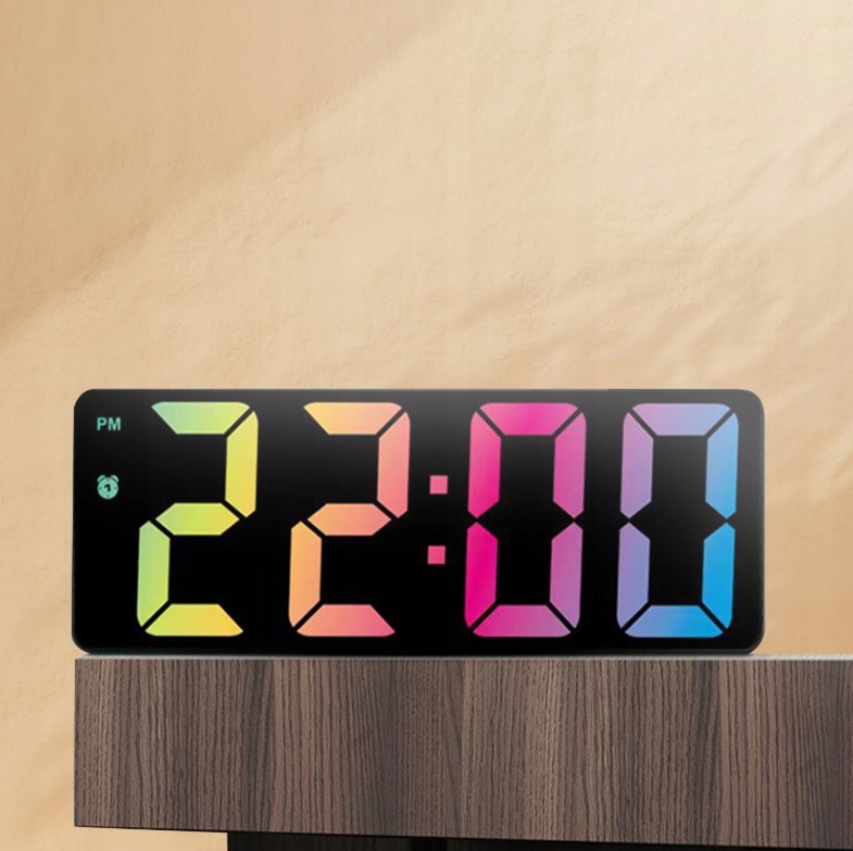 Сучасний багатофункціональний електронний годинник з будильником та кольоровим світлодіодним дисплеєм. Ідеально підходить для спальні, офісу чи дитячої кімнати.