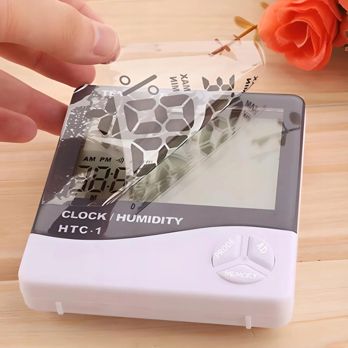 - Прозорий РК -дисплей показує температуру, вологість повітря, дату та час