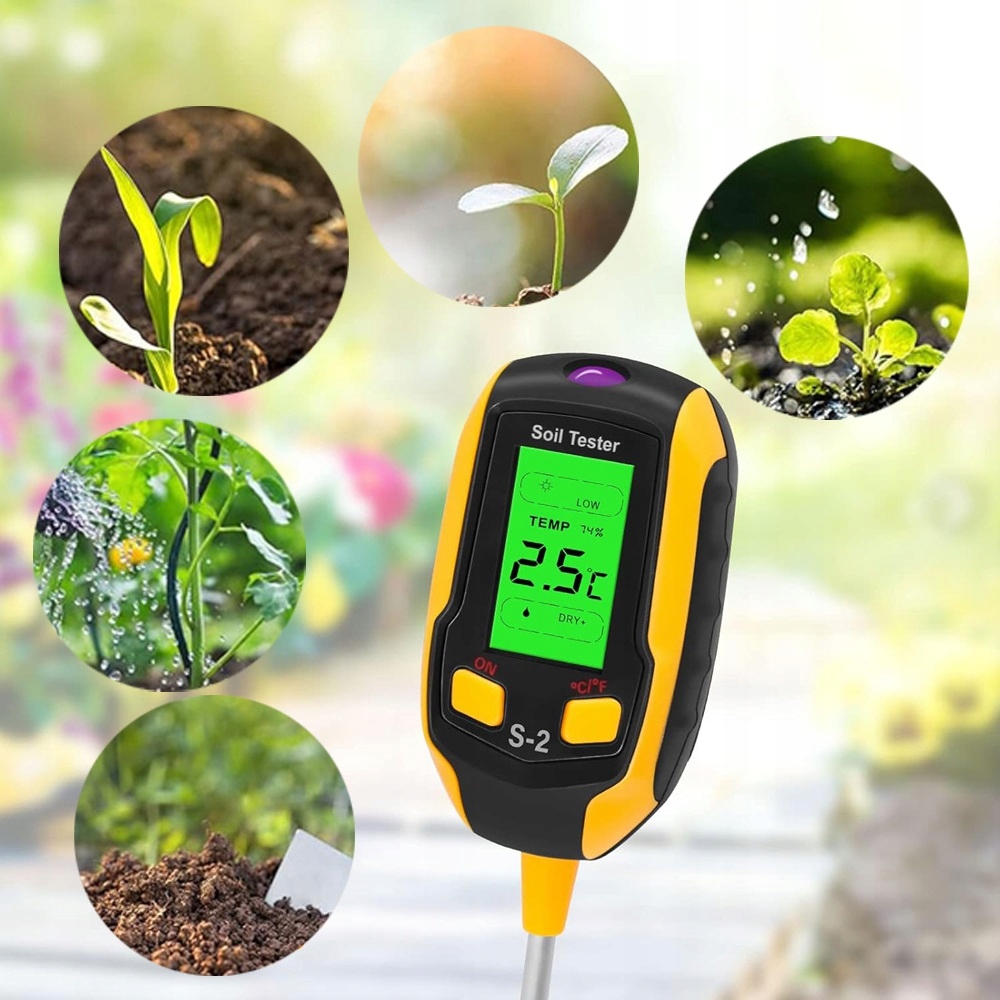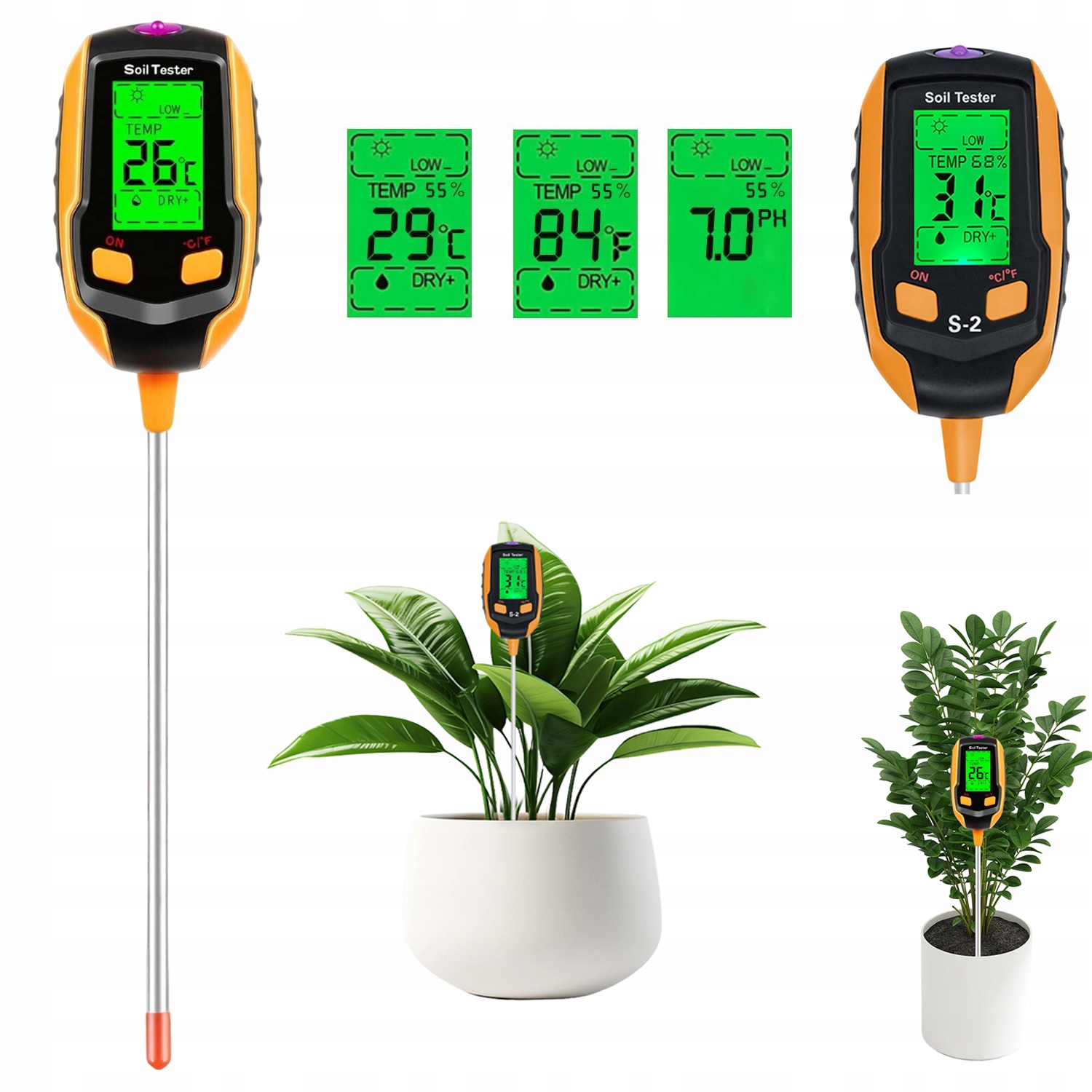 🌱-Можна використовувати для вимірювання сонячного світла (9 рівнів), вологості ґрунту (5 рівнів), рН ґрунту (12 рівнів) і температури (°C і °F).