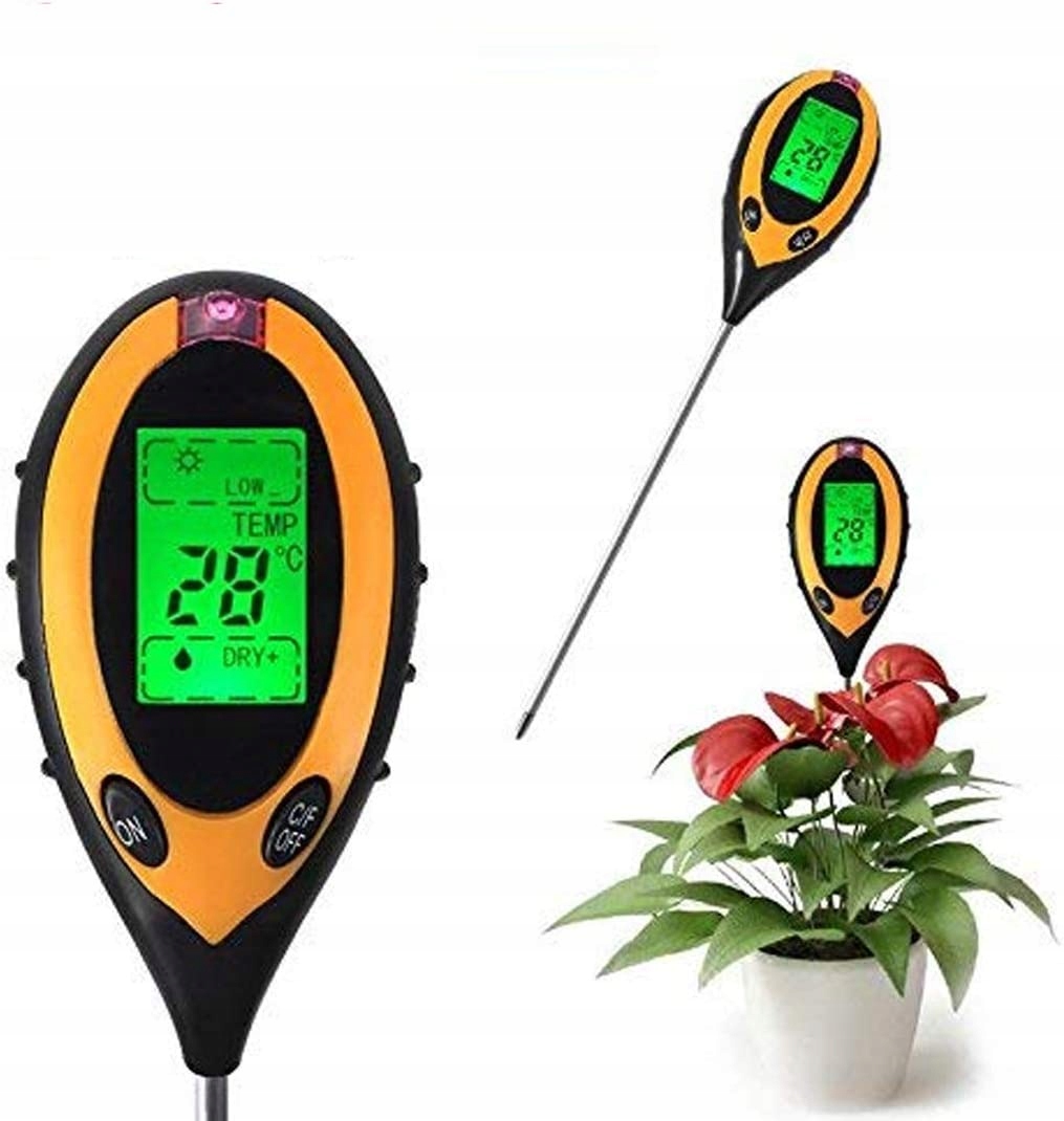 - Вимірювальний прилад 4 в 1 ґрунту, значення pH (12 градусів), інтенсивність сонячного світла (9 градусів), вологості (5 градусів) і температури ґрунту.