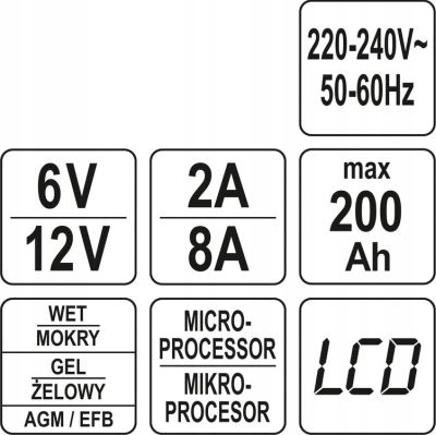Професійний пристрій для зарядки акумуляторів на 6 В і 12 В мотоциклів, легкових автомобілів і мікроавтобусів, сільськогосподарських тракторів і моторних човнів. Він дозволяє завантажити т.зв мокрі батареї, гелеві батареї, AGM і EFB.
