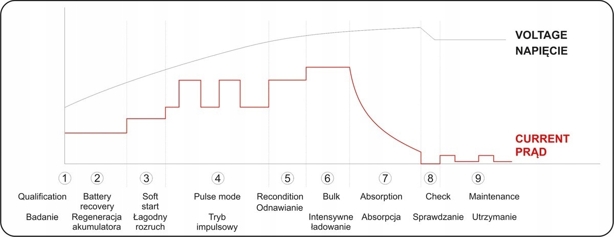 Професійний пристрій для зарядки акумуляторів на 6 В і 12 В мотоциклів, легкових автомобілів і мікроавтобусів, сільськогосподарських тракторів і моторних човнів. Він дозволяє завантажити т.зв мокрі батареї, гелеві батареї, AGM і EFB.