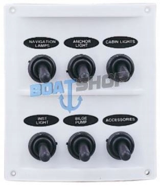 Електрична панель 12 В з водонепроникними вимикачами, з інформаційними табличками.