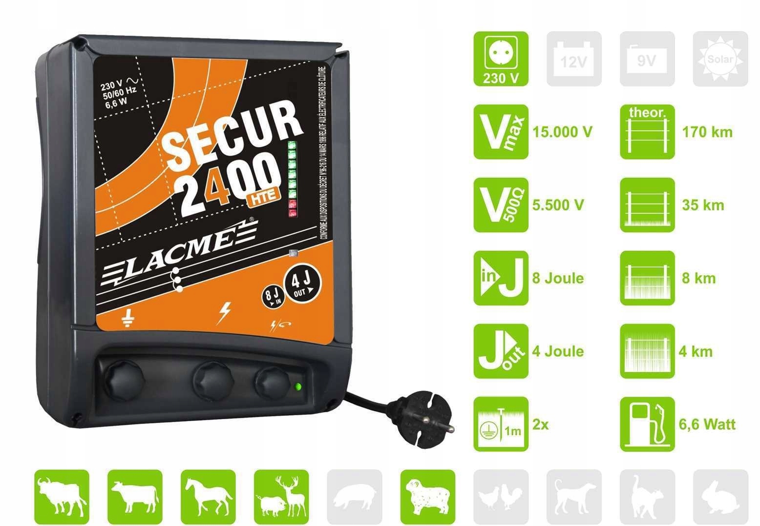Електрифікатор LACME SECUR 2400 HTE відповідає вимогам європейських стандартів безпеки та схвалений Міністерством сільського господарства Франції. Пристрій відповідає необхідним стандартам Європейського Союзу (CE) і перевірено відповідно до європейських стандартів. Електроогорожі (пастухи) абсолютно безпечні для здоров'я людей і тварин. При контакті тварини з дротами електроогорожі виникає короткочасне відчуття болю, викликане потоком електричного імпульсу. Ці імпульси, незважаючи на високу напругу, не несуть загрози здоров'ю та життю, вони лише змушують тварину рефлекторно відступати від огорожі. Надзвичайно практичний та естетичний корпус