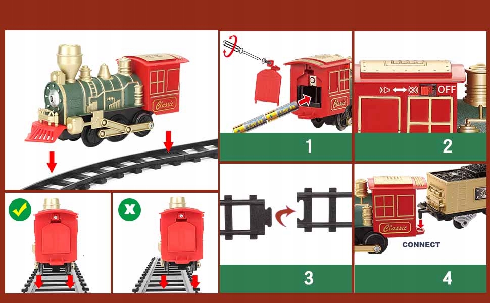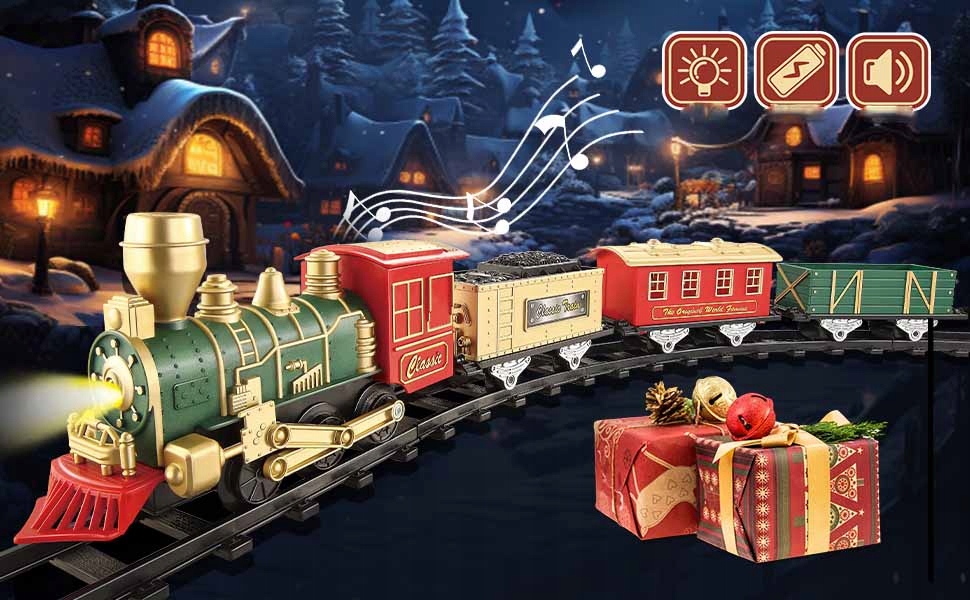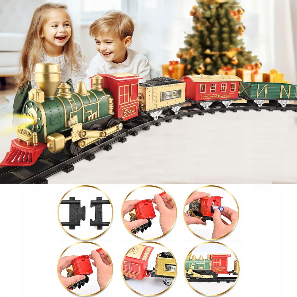 ✔️Реалістичне зображення та звуки: спостерігайте за радістю на обличчі вашої дитини, коли різдвяний поїзд оживає завдяки справжнім звукам поїзда та працюючим фарам. Дітей заохочують використовувати свою творчість, проектуючи та змінюючи макет доріжок. Створіть разом із дитиною незабутні спогади про відпустку, що ідеально підходить для дітей віком від 3 до 7 років.