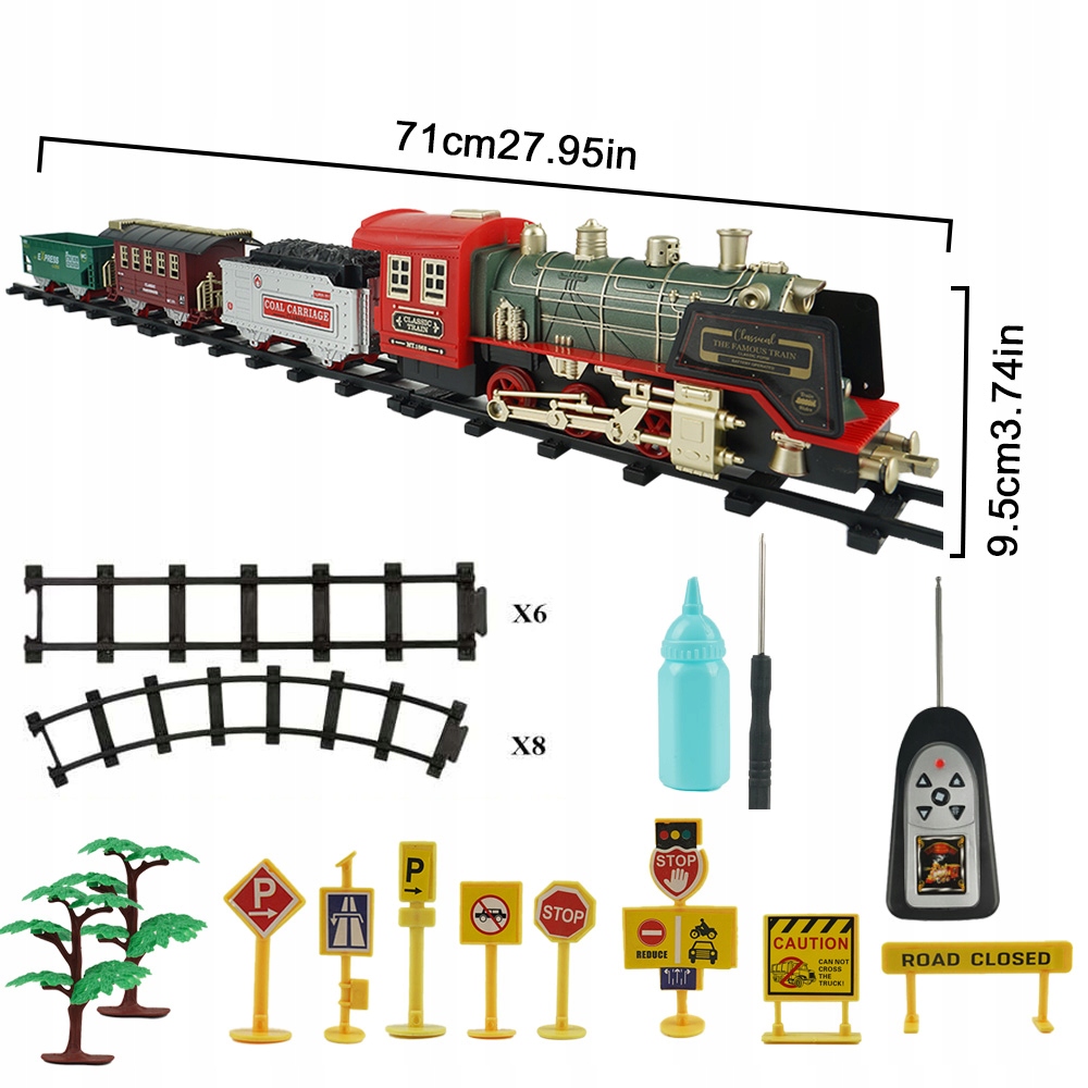 • Великий набір – У пакеті ви знайдете локомотив, 3 вагони, 14 колій (прямих і криволінійних), декорації (дерева, дорожні знаки) і акумуляторну батарею.