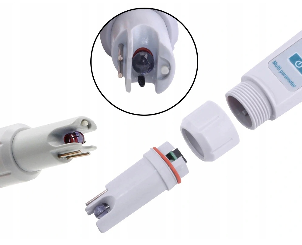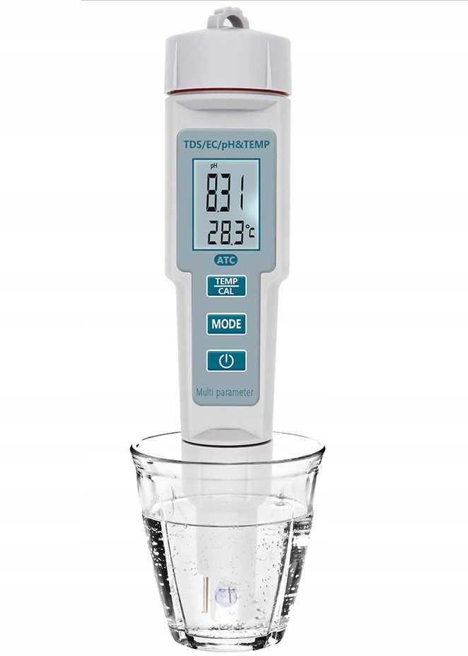 - pH: Вимірює кислотність або лужність води