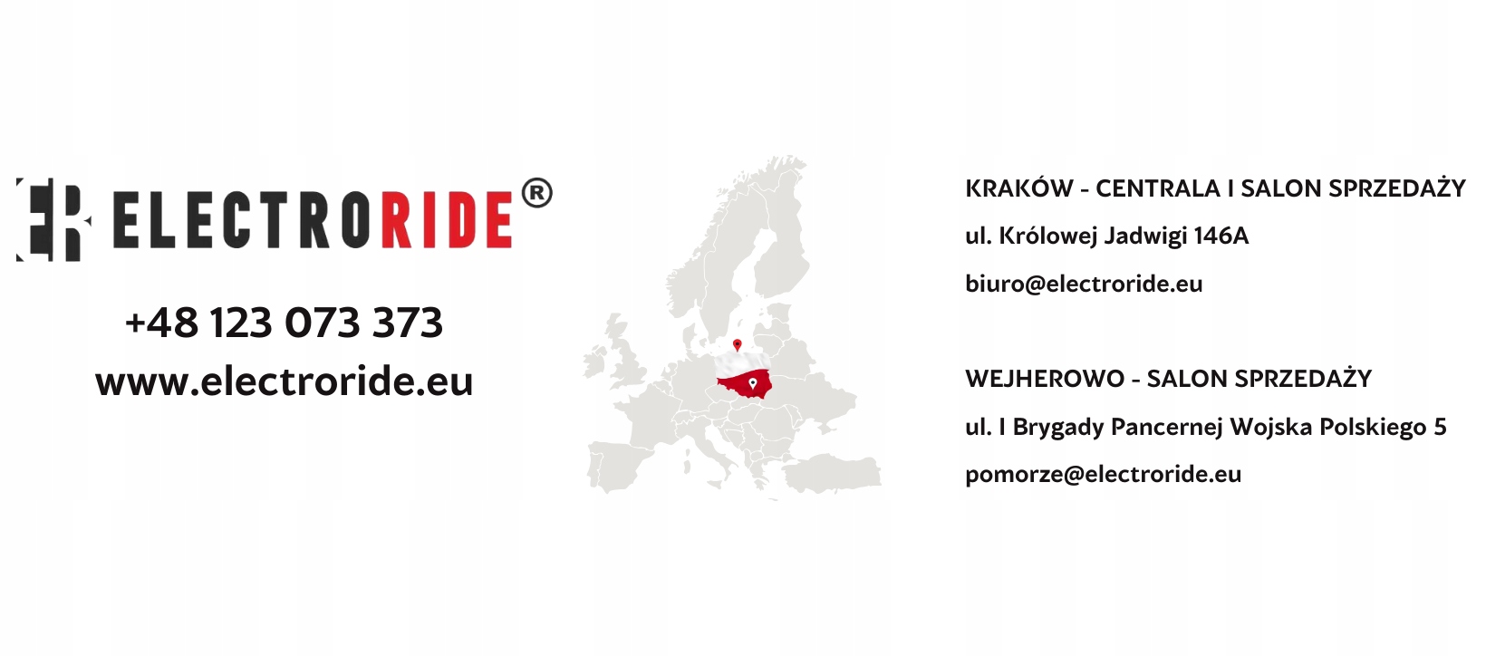 ELECTRORIDE це польський бренд зі штаб-квартирою в Кракові та двома салонами: у Кракові та Вейгерово. Ми докладаємо всіх зусиль, щоб забезпечити найкращу якість наших автомобілів і щоб їх користувачі були задоволені, тому всі моделі проходять детальну перевірку, щоб вони були готові до експлуатації одразу після доставки. Маємо всі запчастини для проданих автомобілів, надаємо послуги стаціонарно та з виїздом до клієнта по всій Польщі