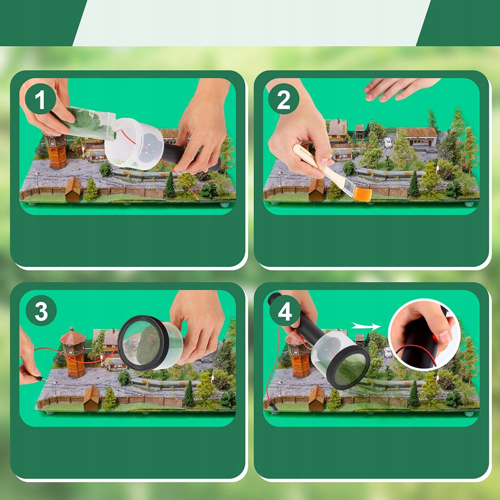 Для невеликих приміщень: пістолет для флокування спеціально розроблений для флокування в невеликих приміщеннях, моделей із пісочницею та інших саморобних проектів. Це ідеальний пристрій для збирання трави на моделях рослин, ландшафтних моделях і будівельних моделях.