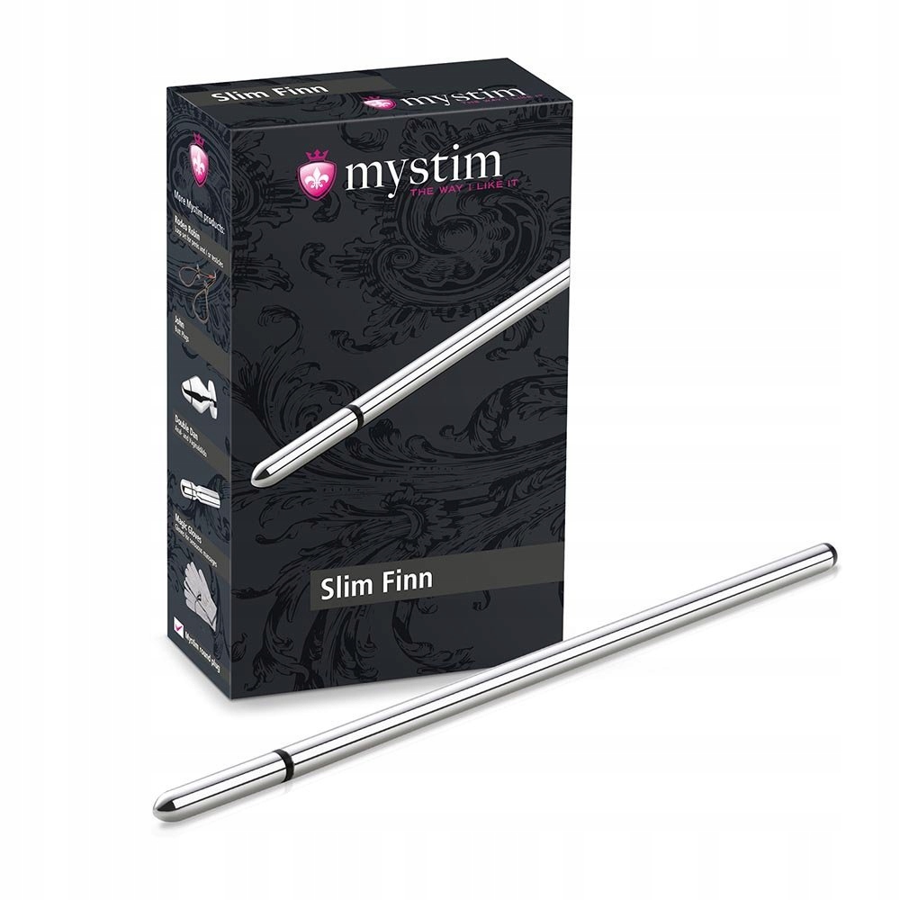 Mystim Slim Finn — це короткий і гладкий уретральний зонд, виготовлений із ретельно полірованого медичного алюмінію, який підходить для специфічної стимуляції пеніса. Елегантний зовнішній вигляд і злегка закруглений кінчик полегшують введення в уретру.