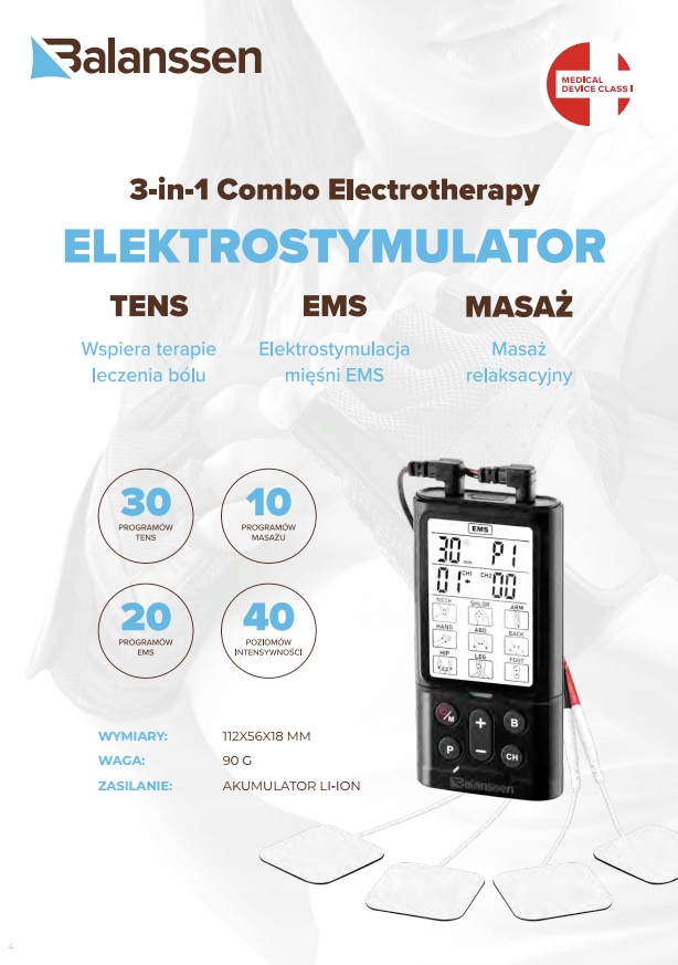 Клінічно перевірений електростимулятор Balanssen TENS/EMS/Mass Electrostimulator забезпечує найвищу клінічну якість медичного обладнання, має медичний сертифікат і зареєстрований в Управлінні реєстрації медичних препаратів і біоцидних препаратів 60 готових програм b> і 9 визначених зон тіла дозволяють використовувати його не тільки в амбулаторних умовах, але і вдома. Це портативний, мобільний пристрій, характеристики якого відповідають професійним стаціонарним електростимуляторам .