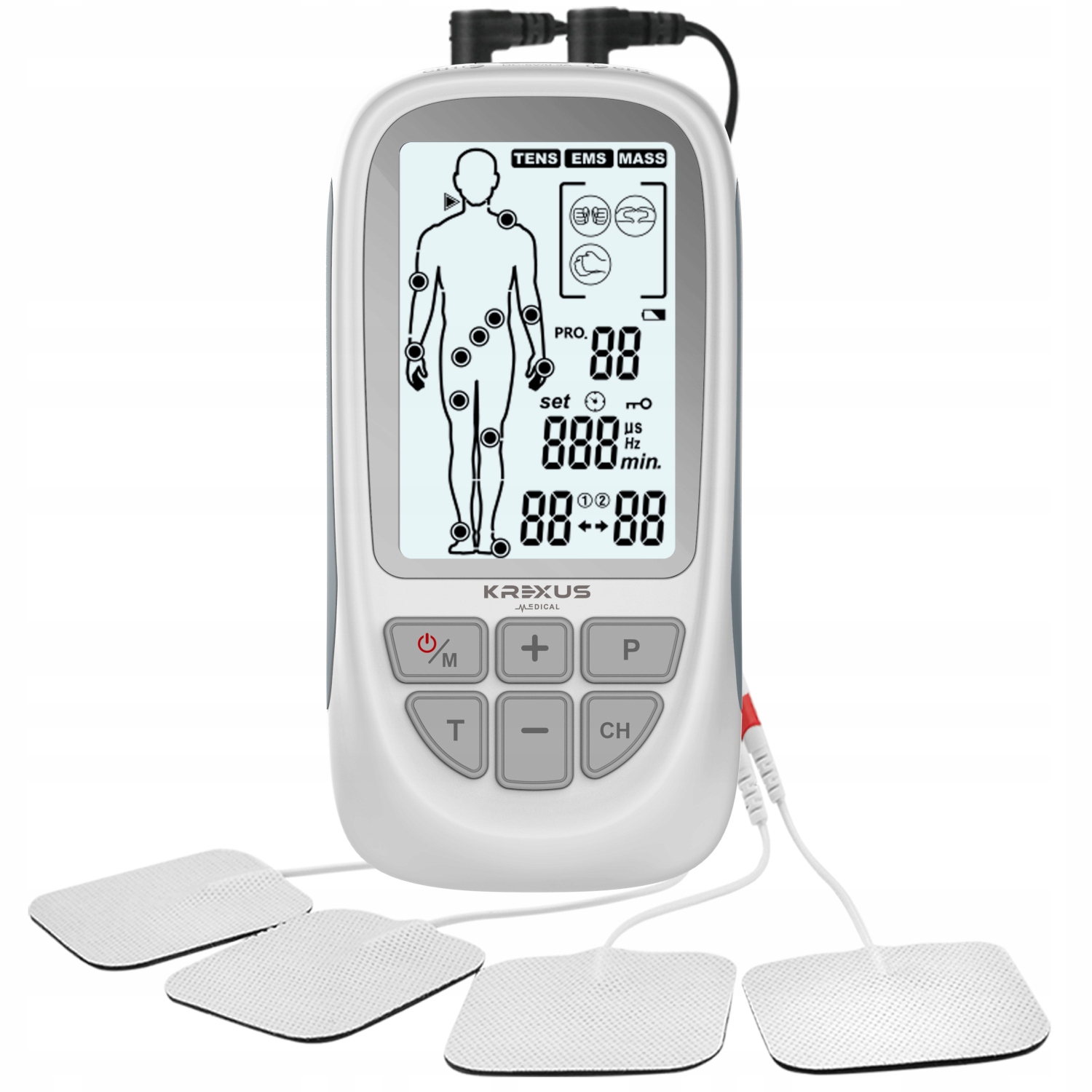 Стимулятор KREXUS – це масажний стимулятор із двоканальним виходом TENS та EMS. Він має три основні функції - TENS (черезшкірна електростимуляція нервів), EMS (електронна стимуляція м'язів) і МАСАЖ.