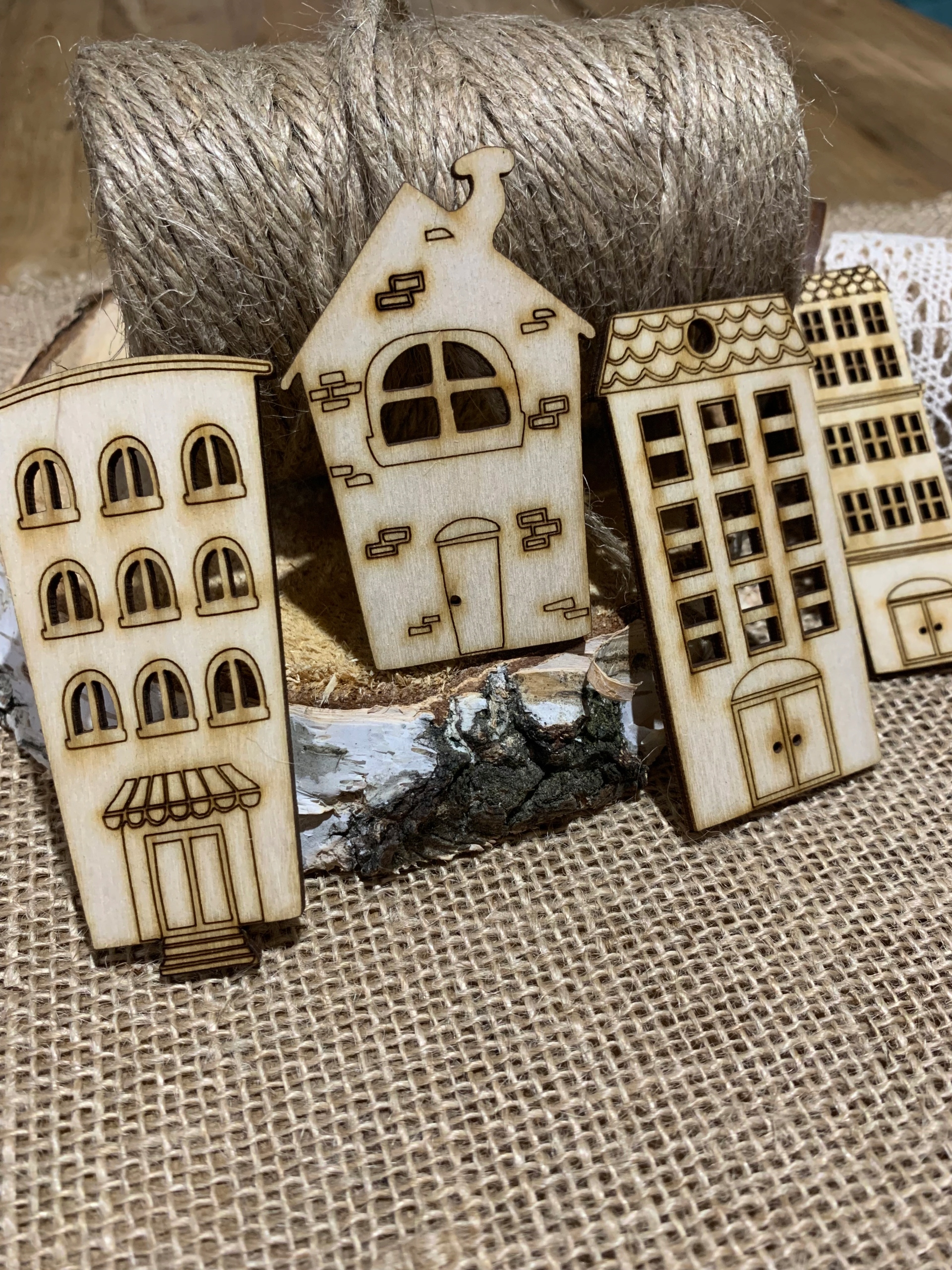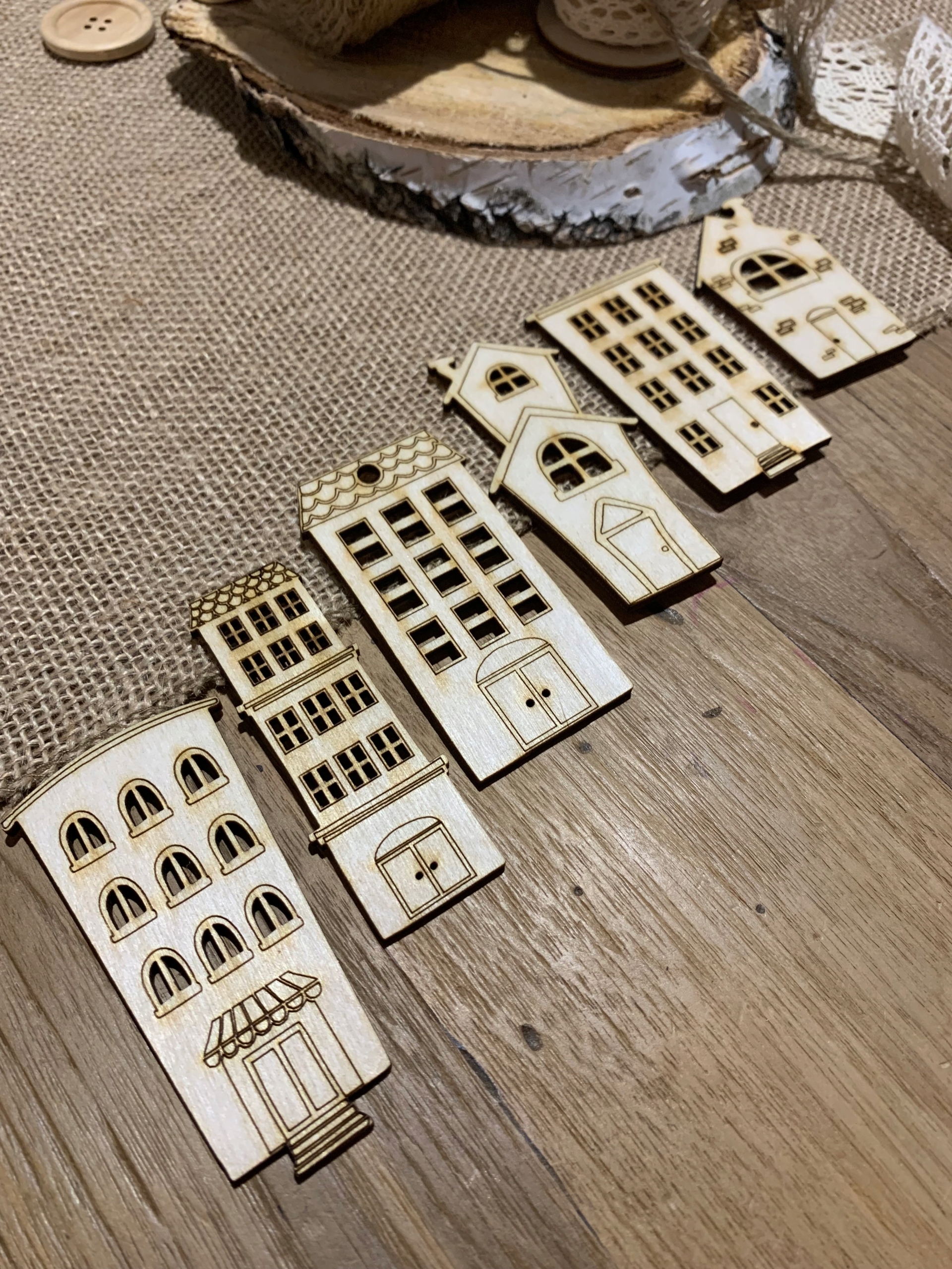 Елементи декору - набір з 6 дерев'яних скрап-будиночків, великих будинків, багатоквартирних будинків