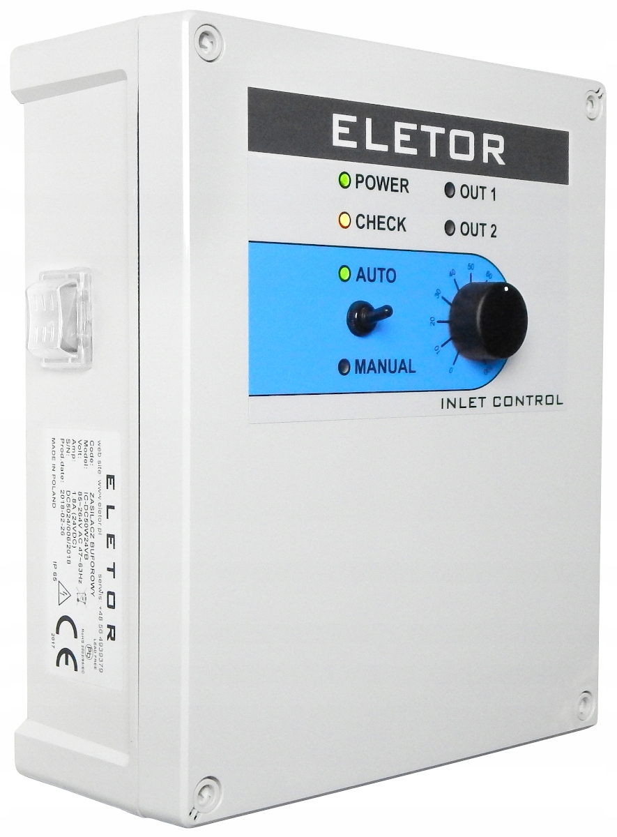 Джерело безперебійного живлення з автоматичним і ручним відкриттям повітрозабірників і виходів повітря. Використовується для забезпечення безпеки сільськогосподарських тварин у разі відключення електроенергії або виходу з ладу контролера. Після виявлення будь-яких порушень пристрій видасть сигнал тривоги та відкриє ліфти до встановленого рівня. Два ліфта можна підключити до електромережі незалежно. Пристрій працює з усіма контролерами та ліфтами, які керуються сигналом 0-10В. Пристрій має вбудований буферний блок живлення 24 В UPS з акумулятором для живлення виконавчих механізмів або ліфтів у системах вентиляції.