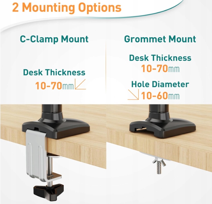 Підставка для монітора постачається з С-подібним затискачем і комплектом для кріплення втулки, ви можете вибрати правильну для свого столу . Варіант A: С-подібний затискач (для столу товщиною 10-70 мм). Варіант Б: якщо на вашому столі є отвір, ви можете вибрати основу для втулки (для столу товщиною 10–70 мм, діаметр отвору 10–60 мм).