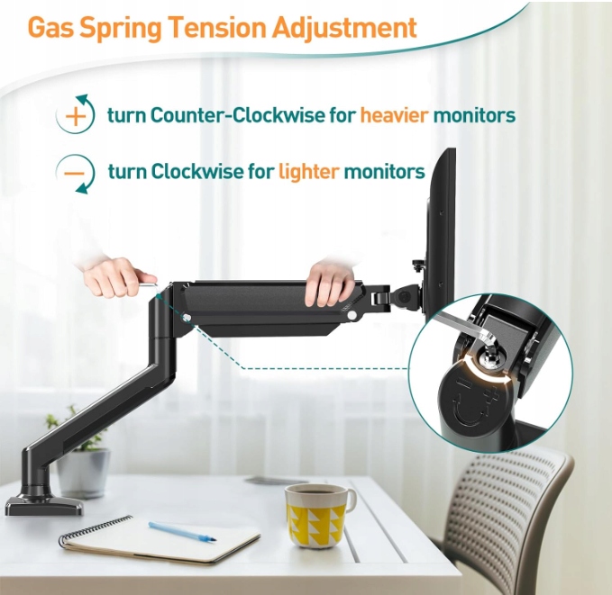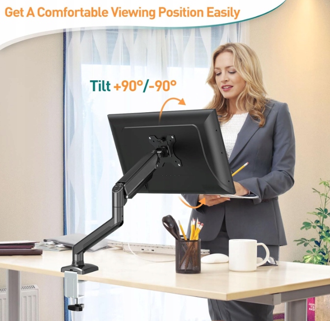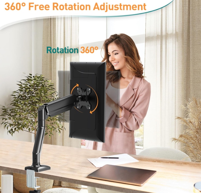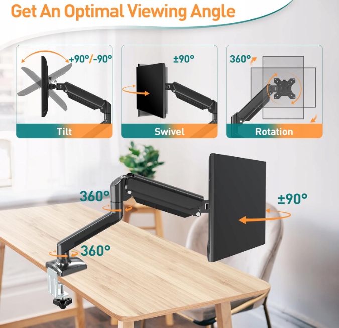 Завдяки ручці з газовою пружиною ви можете плавно регулювати (піднімати, опускати, тягнути, натисніть) монітор у потрібне положення, регулювання висоти 450 мм і довжина розширення 534 мм відповідно до ваших потреб. Обертання на 360° дозволяє легко переходити від горизонтального до вертикального або під будь-яким кутом, нахил +90°/-90° і поворот на 180° для більшої гнучкості. Кращий перегляд допомагає підвищити ефективність роботи.