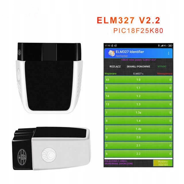 Пристрій із чіпом PIC18F25K80 версії 2.2 підтримує всі доступні на ринку протоколи OBD II (на малюнку показано скріншот із програми ELM327 Identifier.