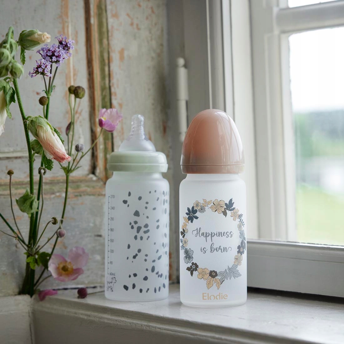 Екологічно чиста скляна пляшечка для годування Elodie із термостійкого боросилікатного скла з соскою з повільним потоком — ідеальна перша пляшечка для вашої дитини. Його не може не вистачати в білизні вашого малюка.