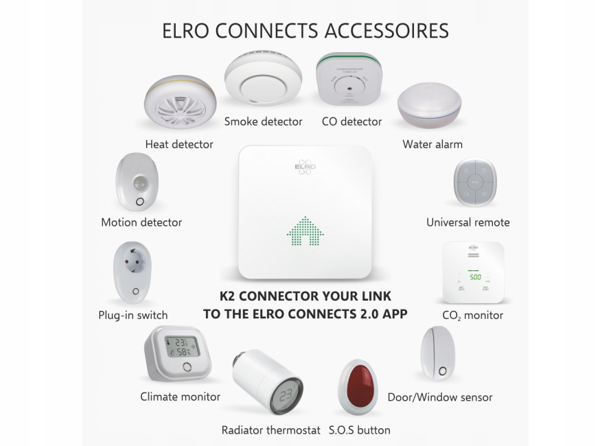 Підключившись до роз’єму K2, ви також можете отримувати сповіщення про ненормальні значення бортового сигналу на свій смартфон. Це також дозволяє легко контролювати якість повітря на вашому телефоні та, якщо необхідно, реагувати на інші продукти ELRO Connects на інші значення якості повітря.