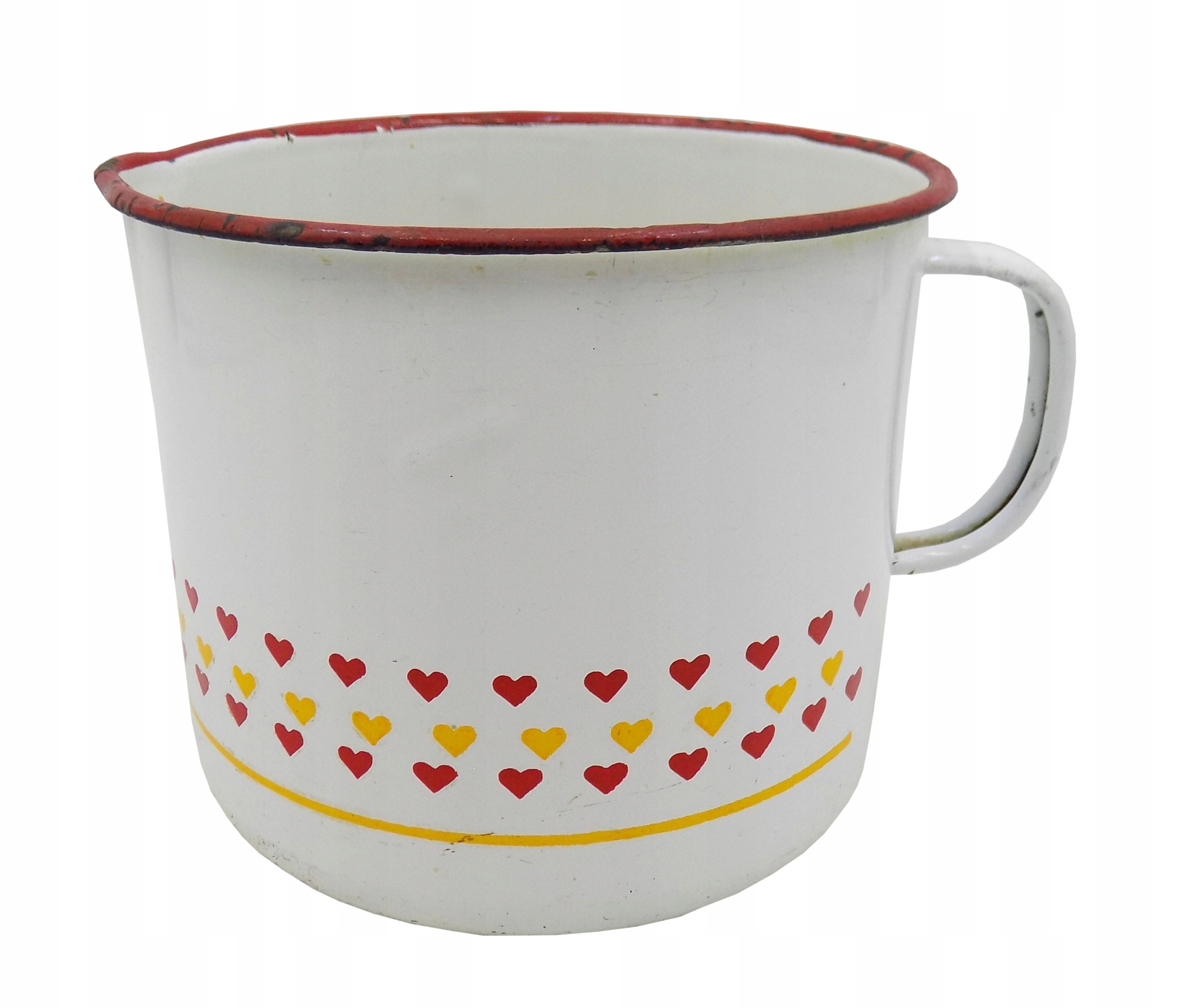 Великий емальований кухоль з носиком часів Польської Народної Республіки. Сліди використання. Розміри; висота 12,5 х 18,5 х 14 см. Стан та дефекти товару видно на фото.