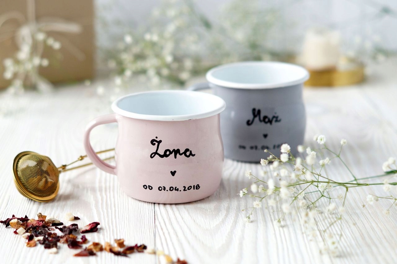 Емальовані чашки чоловіка та дружини, подарунок на весілля, персоналізація з датою весілля