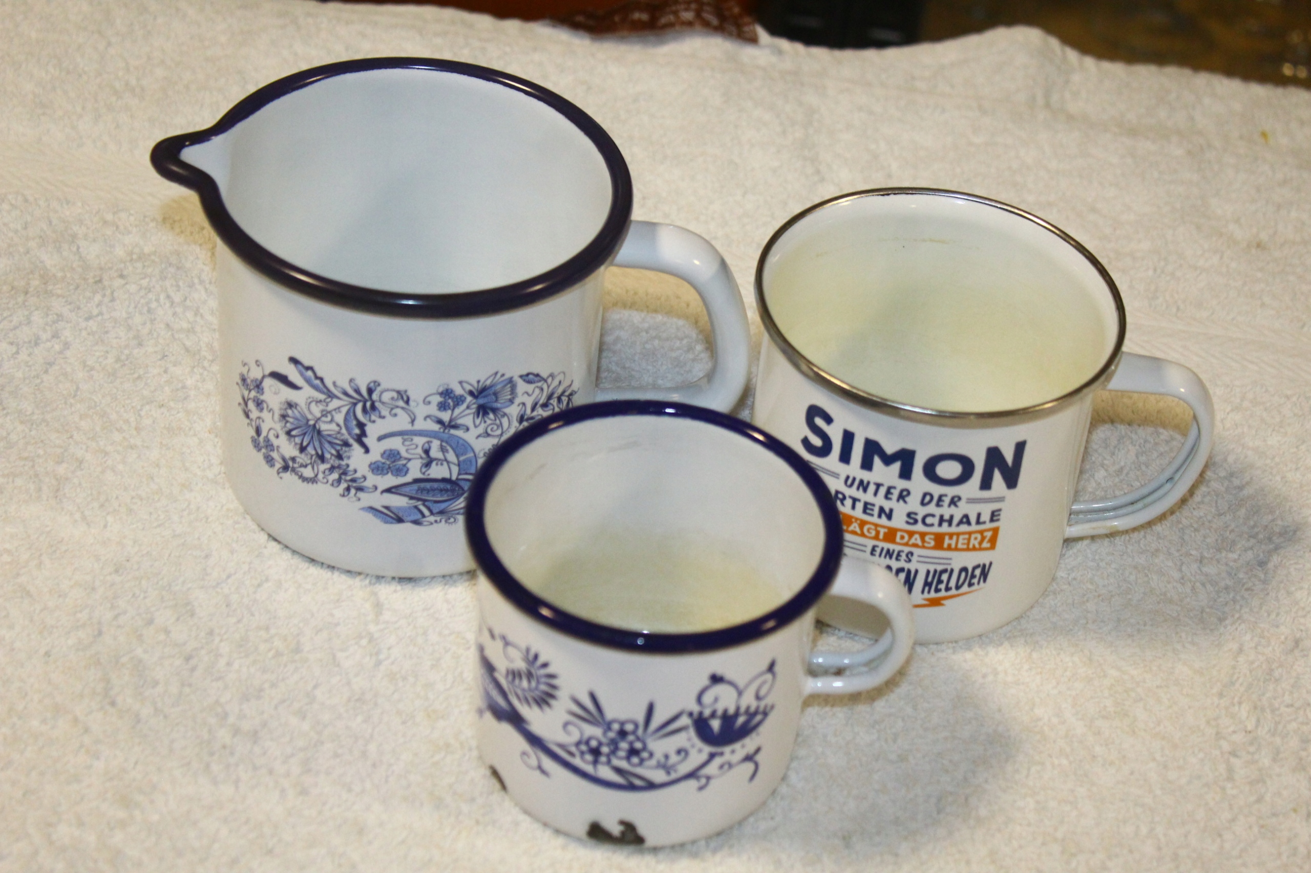 Кружки металеві емальовані, висота від 7,5 до 10 см, діаметр від 9 до 11 см, ємність від 200 до 500 мл, вага 0,60 кг. Гарний стан, без пошкоджень, на найменшій кухлі є вм'ятини, як показано на фото. p> p>