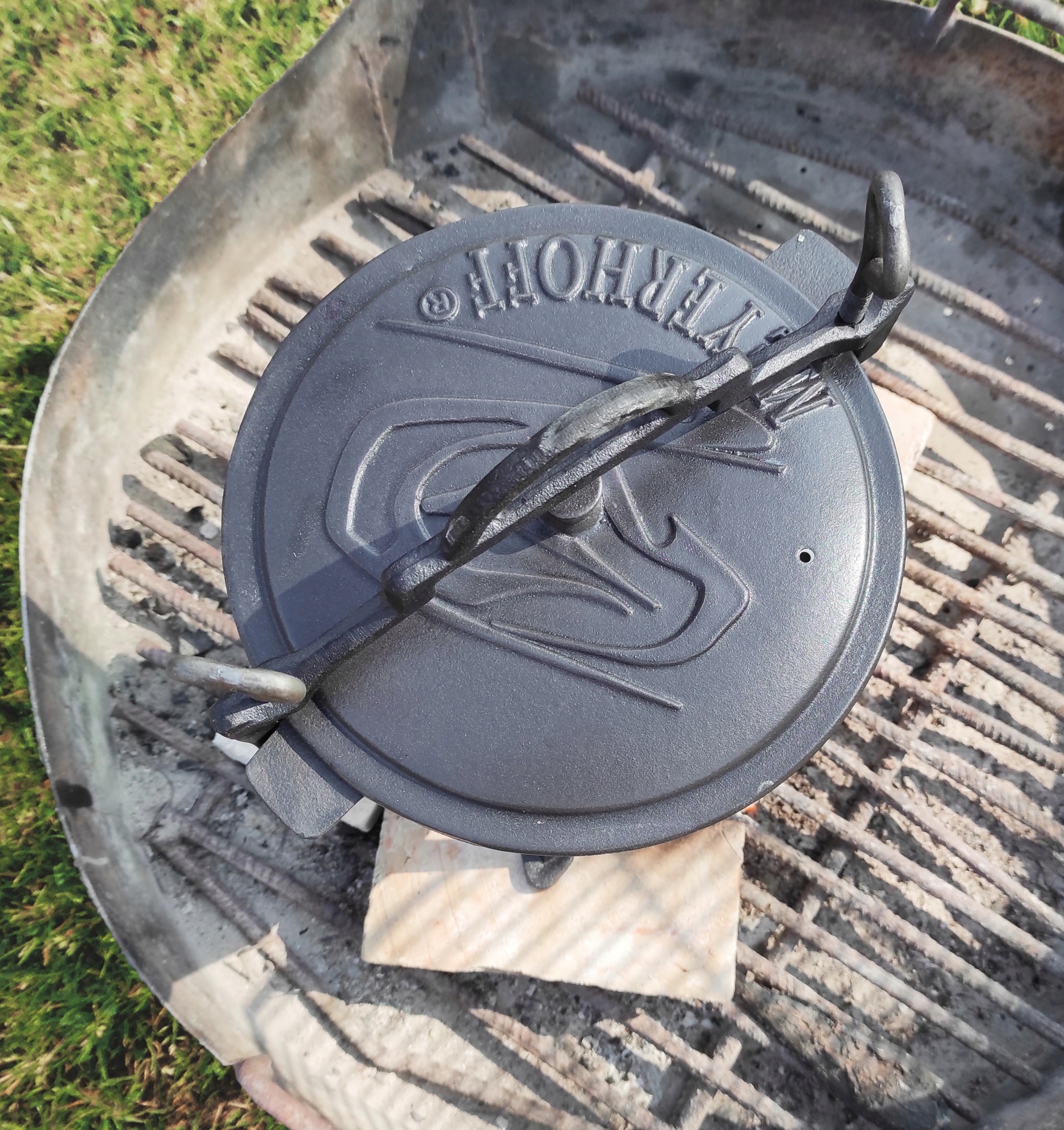 Оригінальний котел Meyerhoffвиготовлений з чавунного сплаву найвищої якості, стійкого до найвищих температур. Ця компанія першою застосувала спеціальний вентиляційний отвір у кришці, який регулює тиск всередині казана, що робить його 100% безпечним. Зсередини він покритий термостійкою емаллю, яка захищає і захищає внутрішню частину казана, що полегшує його миття і догляд (немає необхідності просочувати після кожного використання). Казан можна стояти прямо на вогні, а завдяки зручній ручці його можна також підвісити над вогнем. Виріб також має роз'ємні ніжки, тому казан можна поставити в камін або прямо у вогнище. Завдяки тисненню на обкладинці ви можете бути впевнені, що купуєте оригінальний і безпечний товар.