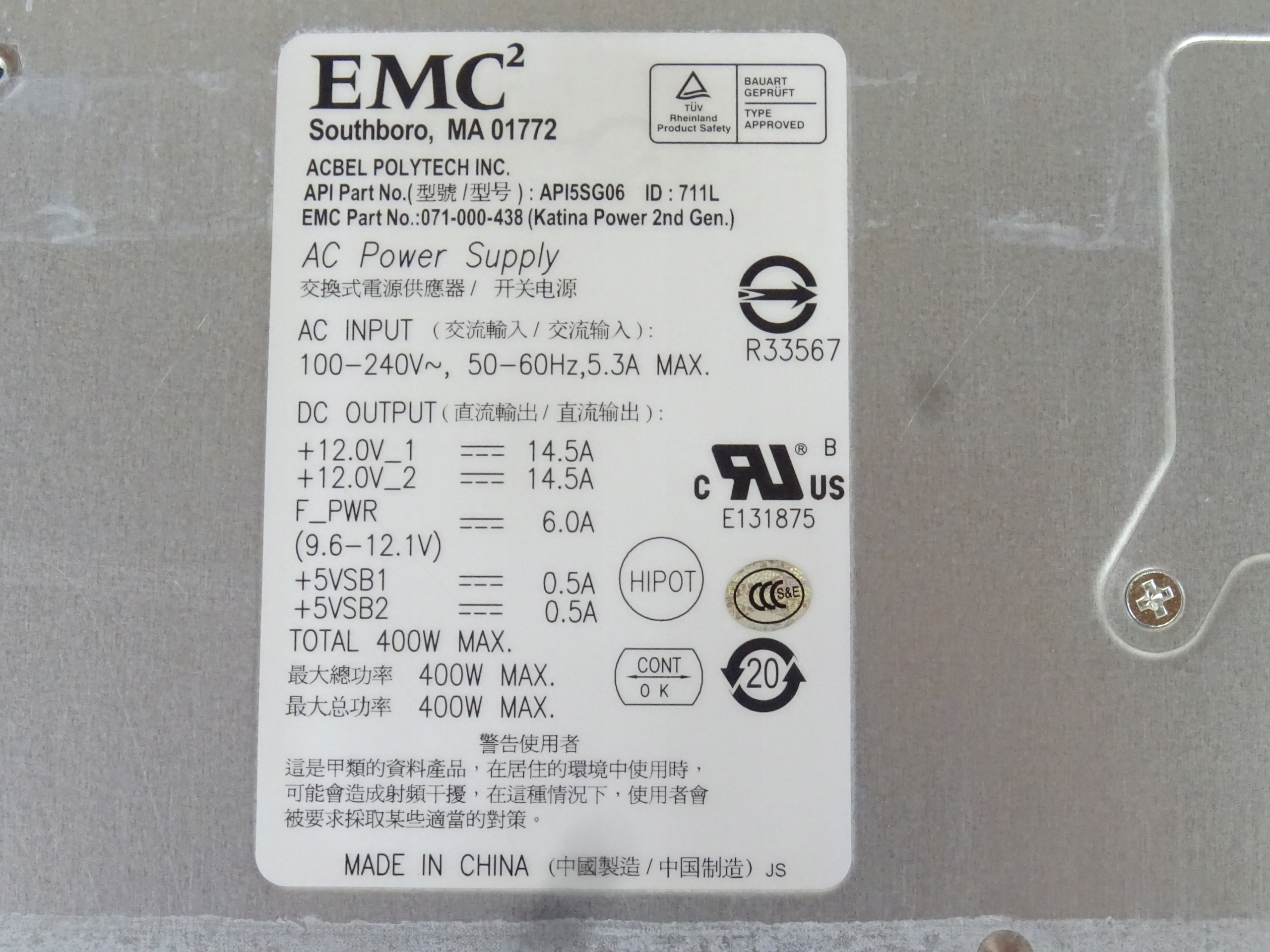 EMC2 ACBEL API5SG06 SERVER POVERSER SERVER