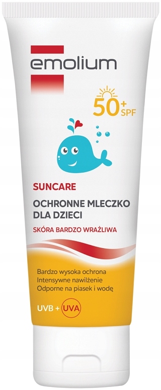 Emolium Suncare захисне молочко SPF 50+ для дітей, призначене для дуже сухої та чутливої шкіри.