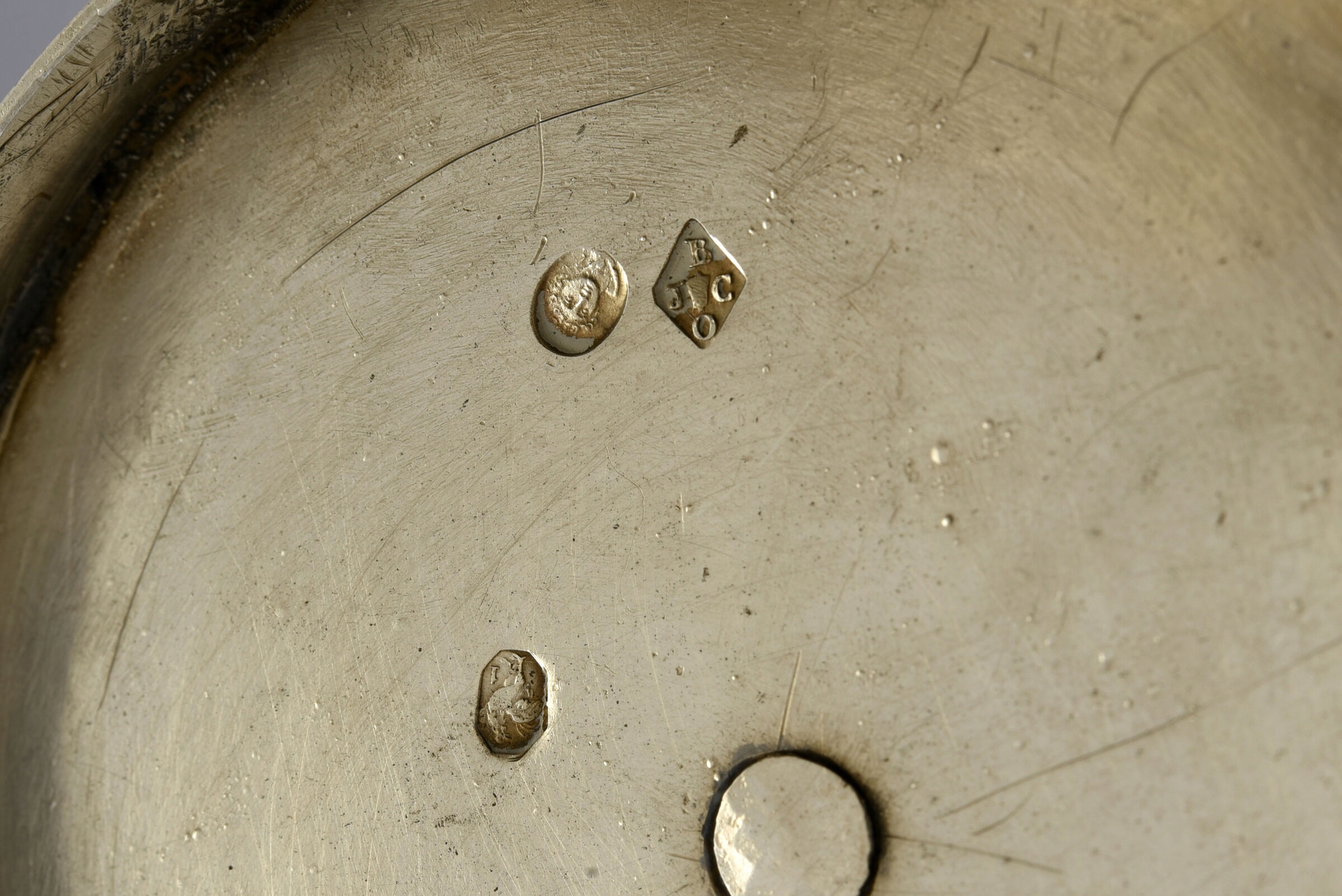 Підписано клеймом золотаря та паризькими клеймами, які використовувалися в 1798-1809 роках, з фігурою півня та цифрою 1 у восьмикутнику, що стоїть для позначення срібла першого ґатунку, та гарантійним знаком – головою старого в овалі. Також видно знак із головою жінки – особливість асоціації паризьких золотих майстрів.