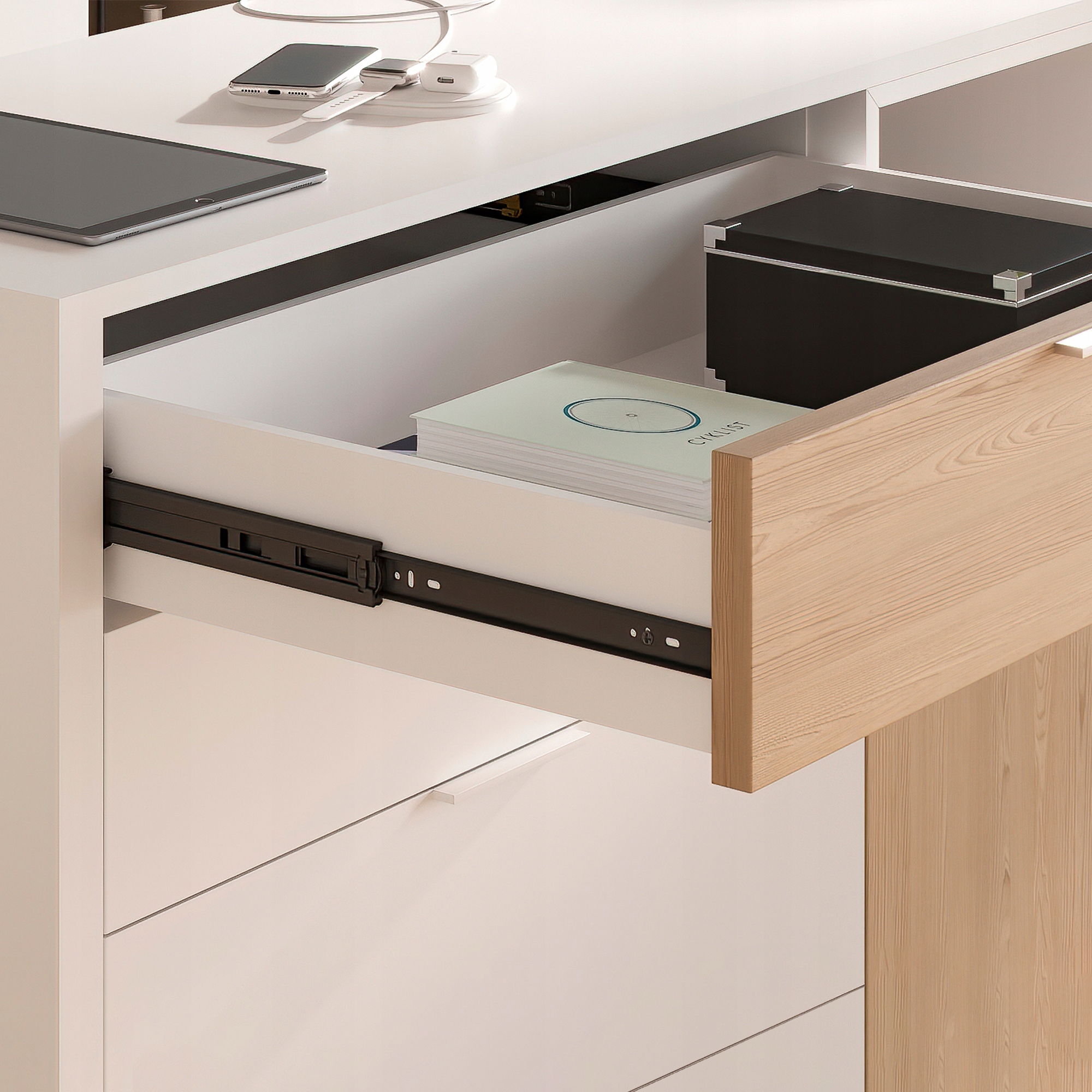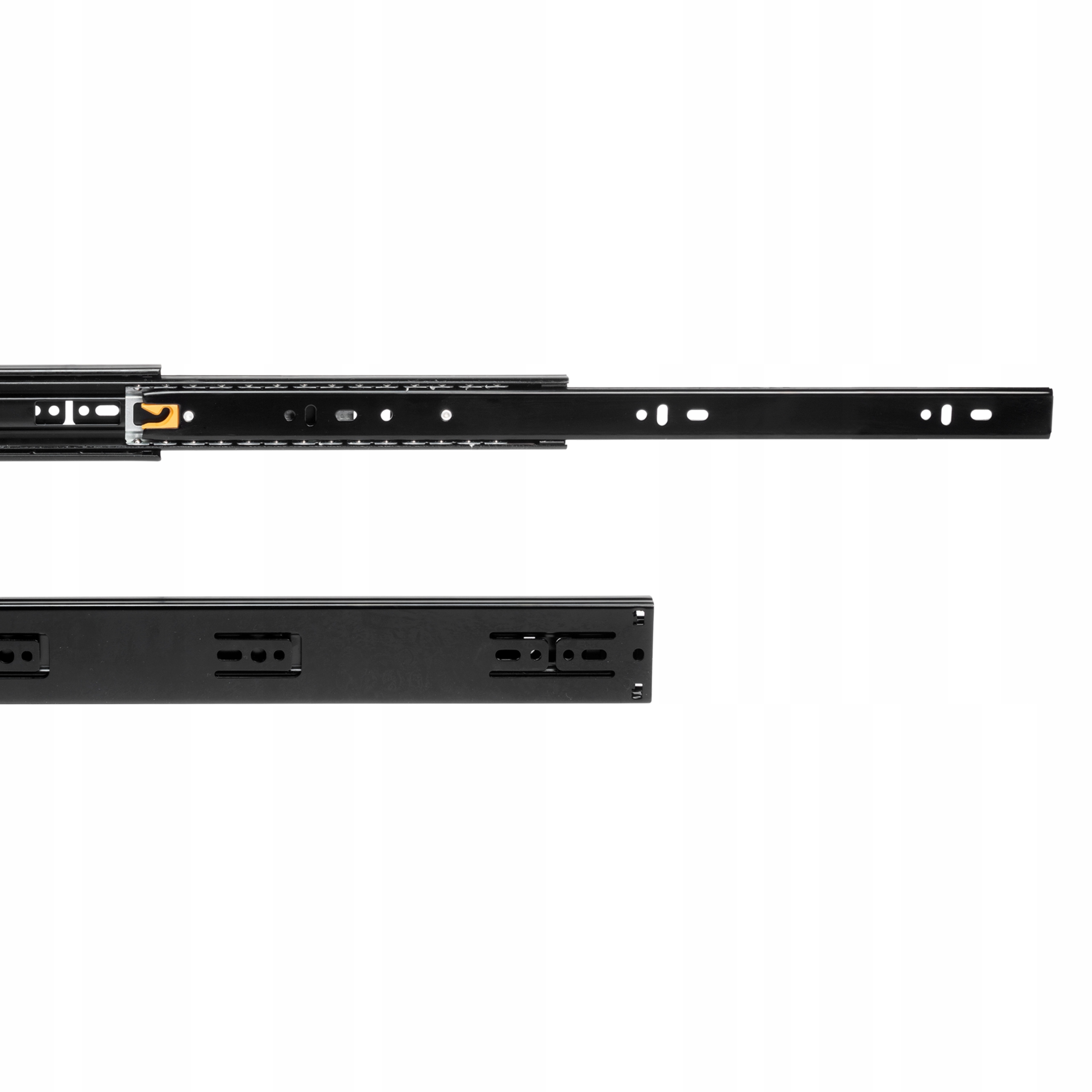 Направляюча повного висунення з системою плавного закривання, яка забезпечує плавне закривання шухляди та ковзає плавно та тихо завдяки високоякісним шарикопідшипникам. Він також має високу вантажопідйомність - до 35 кг на ящик. Збірка виконується за допомогою гвинтів, а розбирання – за допомогою кнопки, яка має власну напрямну.