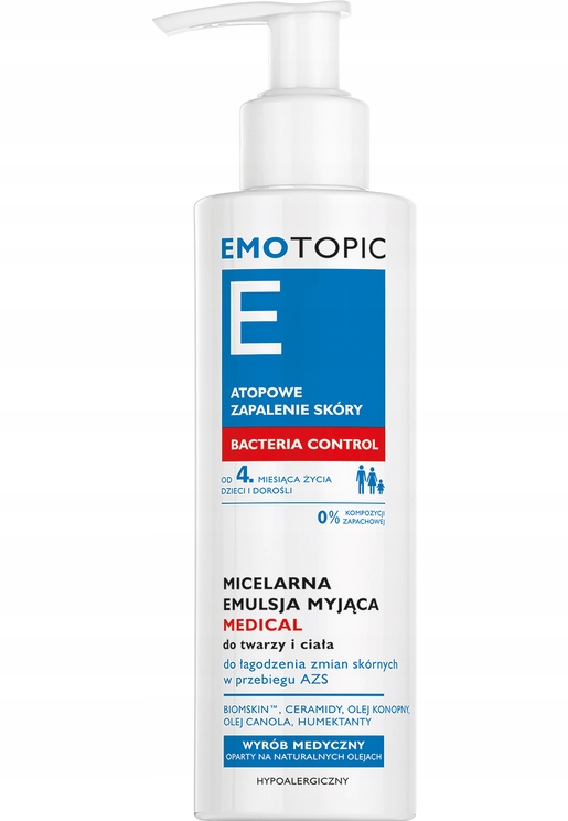 Емульсія заспокоює зміни шкіри під час атопічного дерматиту (АД), ніжно очищаючи шкіру від забруднень, мікроорганізмів і потенційних подразників і алергенів.