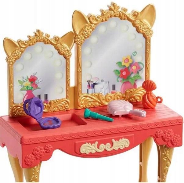 Набір містить багато декорований туалетний столик зі складним декором, подвійне дзеркало та зону відпочинку для ляльки та її вихованця. Такі аксесуари, як духи, гребінець тощо, ідеально підходять для розігрування багатьох чарівних історій.