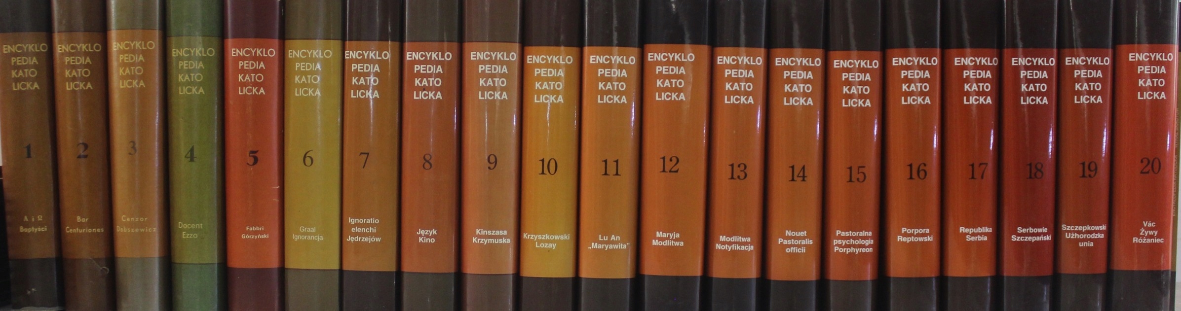 1. А і Ω – баптисти 1985 р.; 2. Бар – Центуріонес (1985,);1424 стор. 3. Цензор – Добшевич (1985), 1408 с. 4. Доцент – Еццо (1985,);1486 стор. 5. Fabbri – Górzyński (1989), 1392 стор. 6. Неуцтво - (1993), 1456 с. 7. Ignoratio elenchi – Jędrzejów (1997); 8. Мова – Кіно (2000); 9. Кіншаса – Кжимуска (2002,);1456 стор. 10. Кшишковський - Лозай (2004,);1424 стор. 11. Лу Ань – «Марьявіта» (2006,);1488 с. 12. Марія – Молитва (2008,);1588 с.; 13. Молитва - Повідомлення (2009, ) 1456 с. 14. Nouet – Pastoralis officii (2010);1456 стор. 15. Пастирська психологія – Порфирон (2011, );1456 с. 16. Порпора – Рептовський (2012,);1456 стор. 17. Республіка – Сербія (2012) 1456 стор. 18. Серби – Szczepański (2013), 1456 стор. 19. Щепковський – Ужгородська унія (2013) 1456 с. 20. VÁC – Żywy Różaniec, 2014, 1664 с. Список скорочень -127 с. 1993. ; Католицька енциклопедія;–;енциклопедія;спеціалізована видана в 1973–2014 роках у Любліні Науковим товариством Люблінського католицького університету Івана Павла ІІ. Його підготовлено в Лексикографічному інституті Люблінського католицького університету у співпраці з Науковим товариством Люблінського католицького університету. В енциклопедії представлені доктринальні питання та діяльність Католицької Церкви та інших християнських Церков: Православної та Протестантської, релігійних громад та нехристиянських релігій. Містить записи з історії Церкви в Польщі та в усьому світі, з теології, християнської культури та мистецтва, а також із сфери католицького соціального вчення.