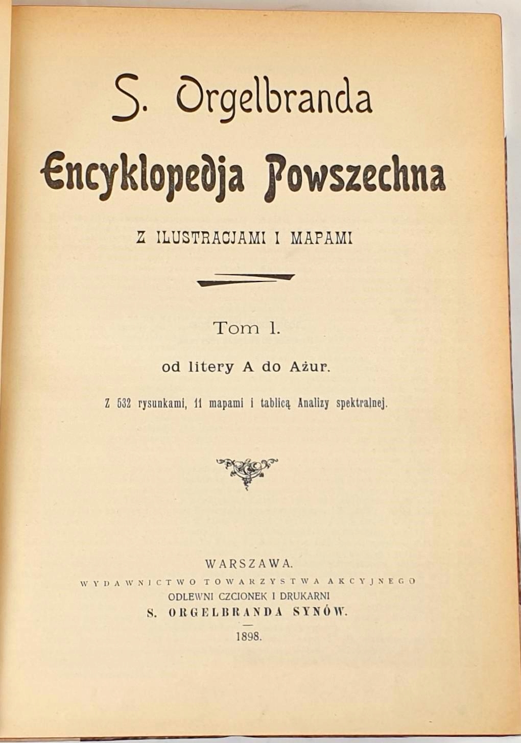 Останнє видання першої сучасної польської енциклопедії, розпочате Самуелем Оргельбрандом у 1859 році. Пропонований набір є продовженням цих робіт його синів Мечислава (1847-1903) та Іполита (1843-1920). Він включає 16 основних томів з додатками та помилками та 2 додаткові томи, які вийшли друком у 1911-12 роках. Містить понад 10 000 ілюстрацій у тексті (кілька сотень у кожному томі), кілька десятків кольорових карт (літографованих) і кольорових, частково хромолітографованих і чорно-білих дошок ілюстрацій.
