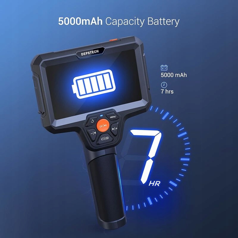 Вбудований акумулятор великої ємності 5000 мАг забезпечує безперервну роботу ендоскоп протягом приблизно 7 годин. Значне покращення терміну служби батареї порівняно з іншими аналогічними продуктами на ринку. Заощаджуйте зусилля пов’язані з частим заряджанням.