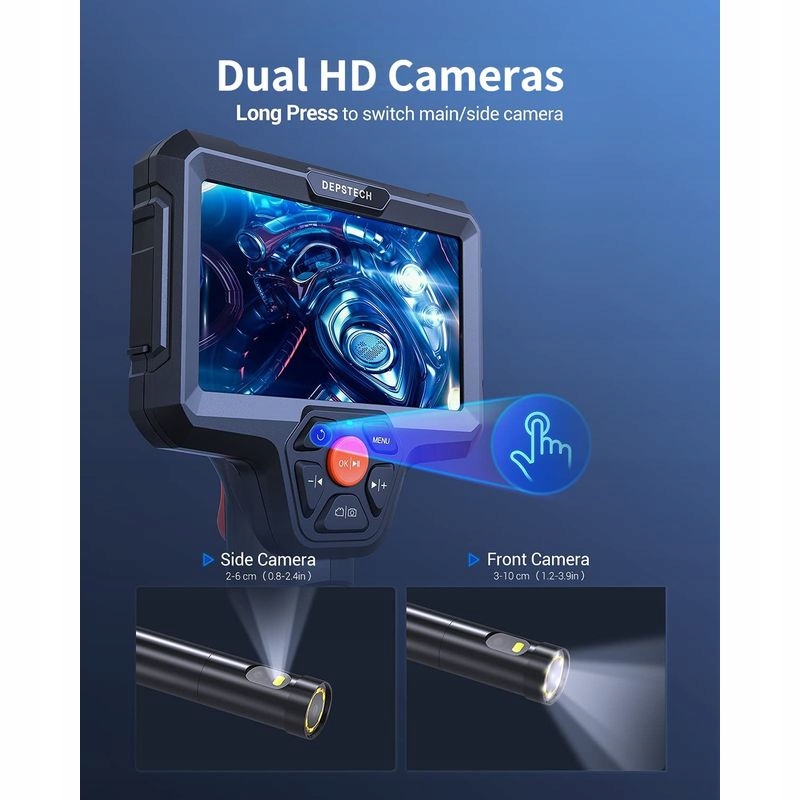 Додаткова HD-камера вбудована збоку від основної камери, щоб допомогти виявити сторони труби. Кнопка перемикання камери вбудована в панель КОНТРОЛЬ. Промисловий ендоскоп забезпечує широкий кут огляду 180 градусів, дозволяючи зафіксувати більше деталей. Це має 7 регульованих світлодіодних індикаторів на кінчику камери та додає яскравий світлодіодний ліхтарик на задній частині тіла для нічних робіт. Подвійні камери високої роздільної здатності забезпечують ширше поле зору. Натисніть кнопку, щоб перемикатися між ними бічна та передня камери.