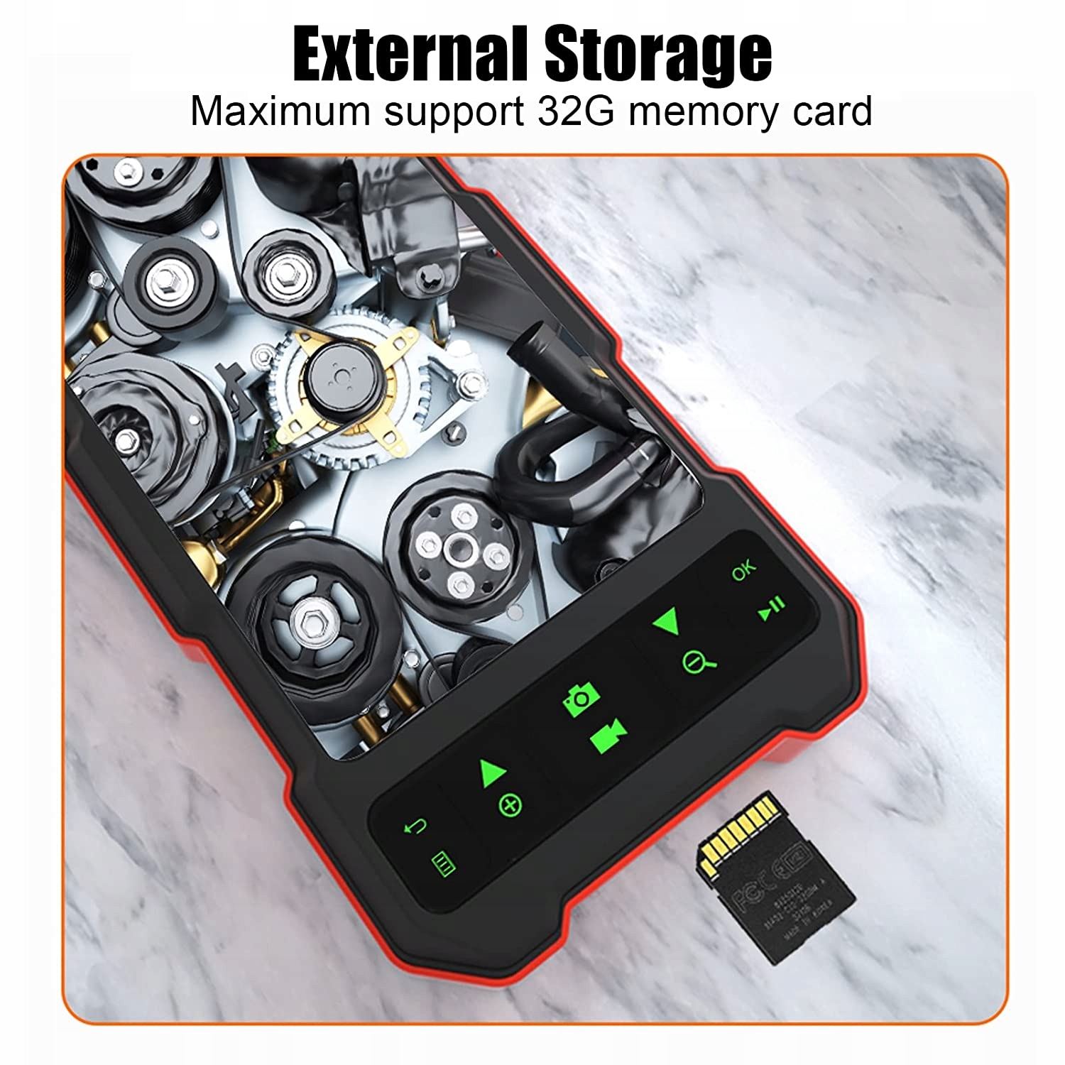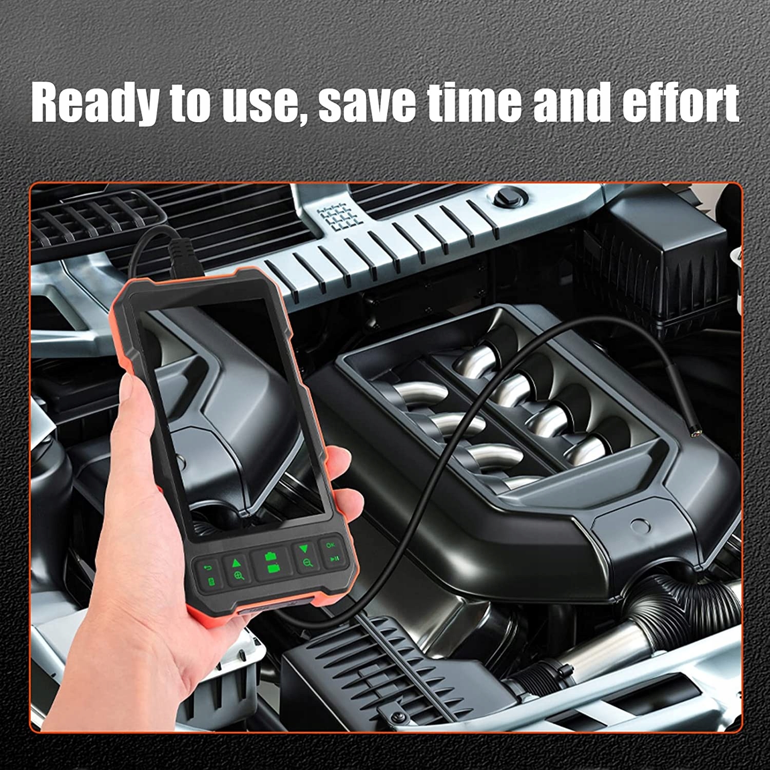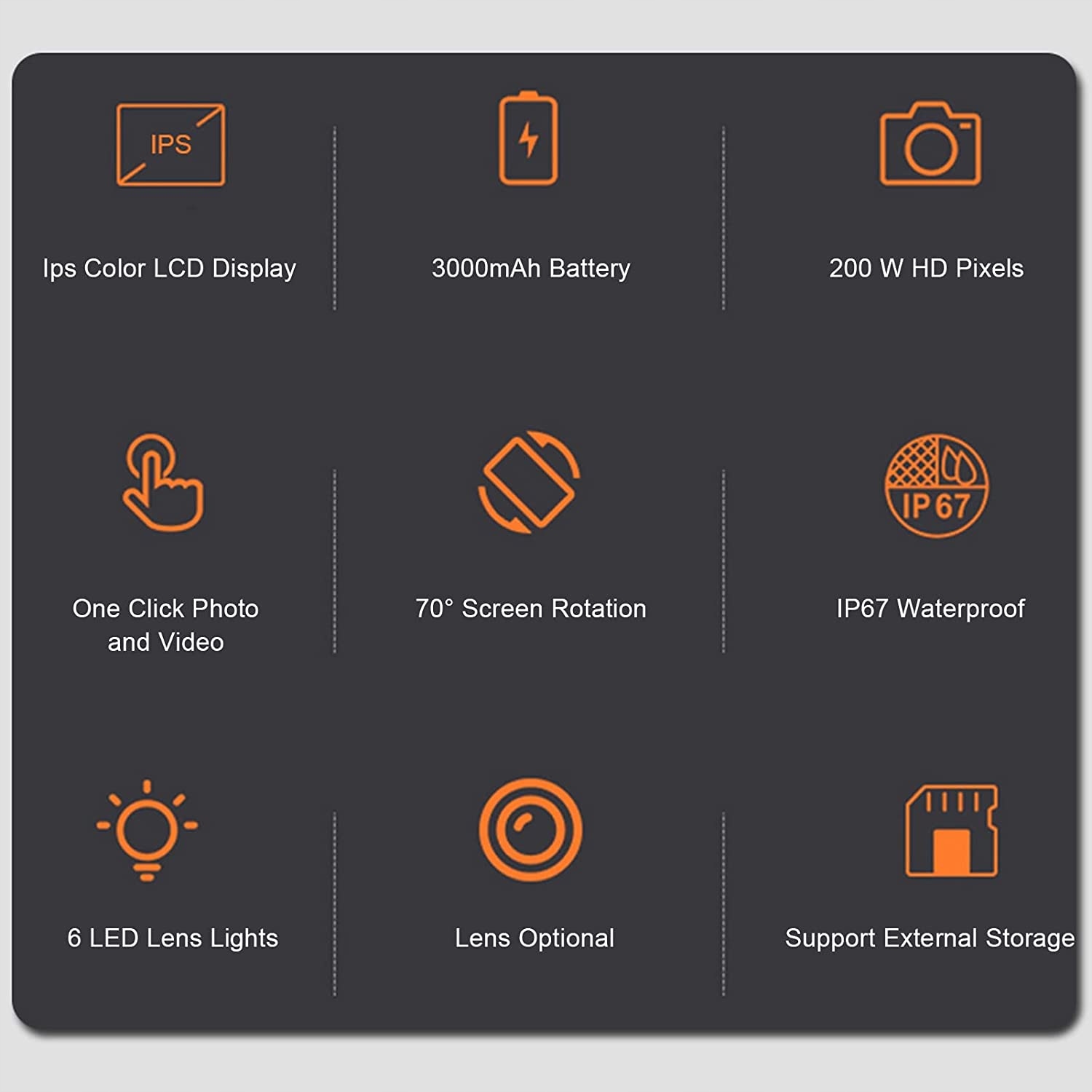 ЧІТКИЙ ДИСПЛЕЙ Ендоскоп має 45-дюймовий кольоровий екран високої роздільної здатності з широким кутом огляду 178 градусів і має більш чітку якість зображення та динамічне відео, ніж звичайні екрани. HD-КАМЕРА HD-камера на 1080 пікселів забезпечує відео та зображення високої чіткості, які широко використовуються в автоматизованому технічному обслуговуванні, керуванні машинами, ремонті сантехніки та контролі каналізації тощо. КОЛЬОРОВИЙ ЕКРАН IPS Цей промисловий ендоскоп оснащений кольоровим екраном IPS, який допомагає отримувати більш стабільні та чіткі зображення та плівки, а промисловий корпус захищає від важких умов праці. ІНШІ ЧАСТИНИ Включає водонепроникний зонд IP67 із 6 світлодіодами для забезпечення належної роботи в дощових темних і вологих середовищах, а також поставляється з міцним напівжорстким кабелем бороскопа довжиною 164 фути та 5 метрів. ЛЕГКИЙ У ВИКОРИСТАННІ Цей ендоскоп поставляється готовим до використання без програми Wi-Fi або телефону. Він може допомогти вам перевірити циліндри вашого автомобіля, заглянути всередину стінок, перевірити наявність витоків та іржі, засмічених водостоків тощо.