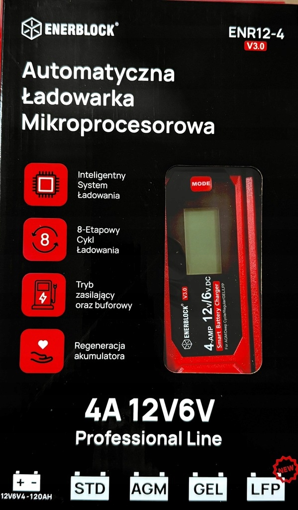 Enerblock ENR12-4-це повністю автоматичний мікропроцесорний зарядний пристрій, призначений для зарядки традиційних кислотно-оельських акумуляторів, гелю, гелю (гель), AGM, EFB (Start-Stop), LifePo4 VRLA з волюною 6/12V. Від 1 Ах до 120AH.