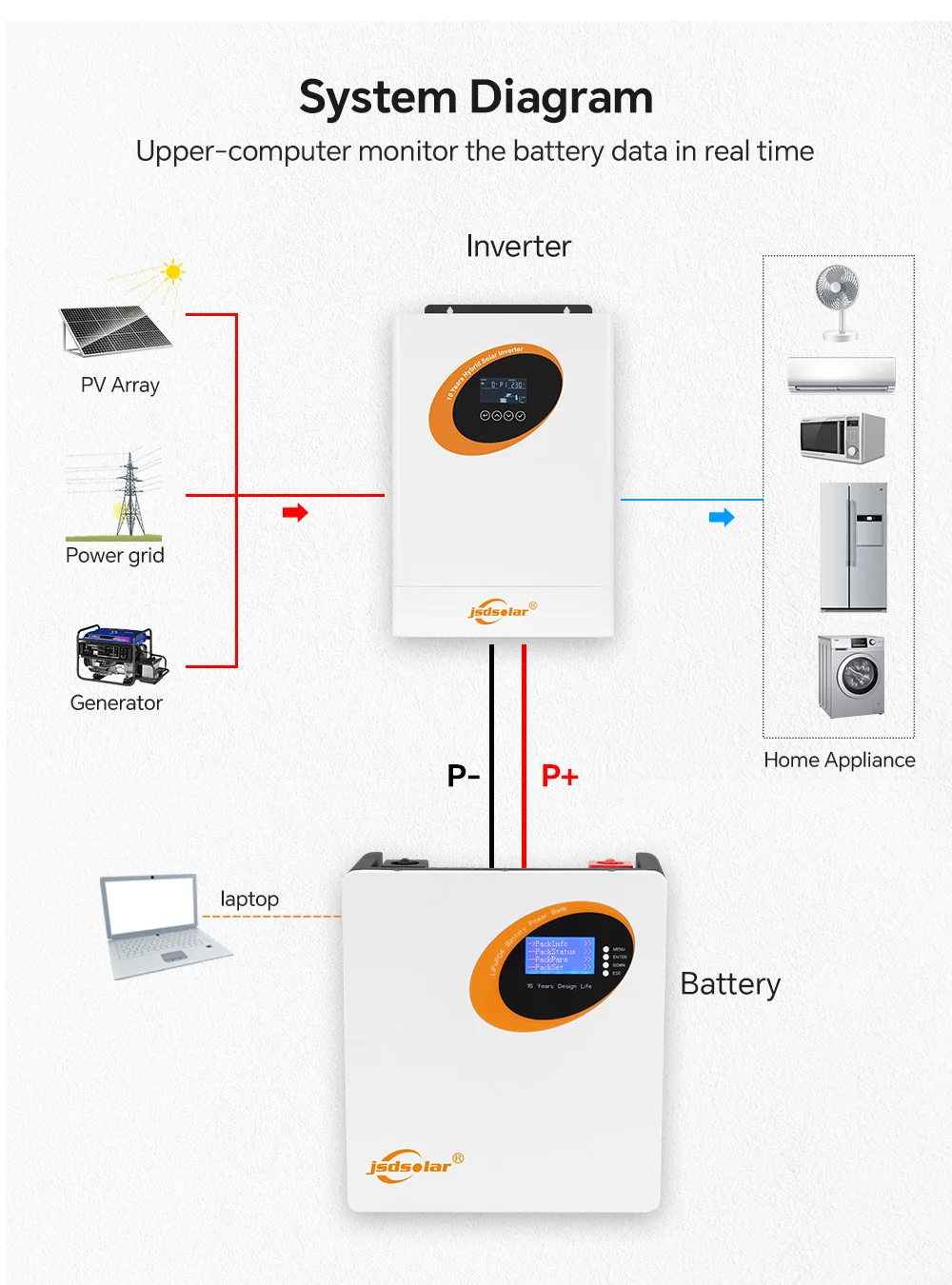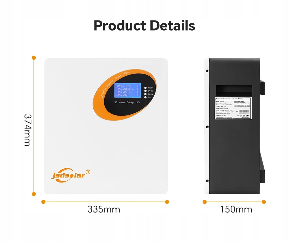 - РК -монітор: моніторинг даних про потужність зберігання енергії та роботи. JSDSOLR Power -це відомий бренд, який пропонує високоякісні сертифіковані продукти CE. Продукт виглядає естетично і довговічно. На основі CATL.