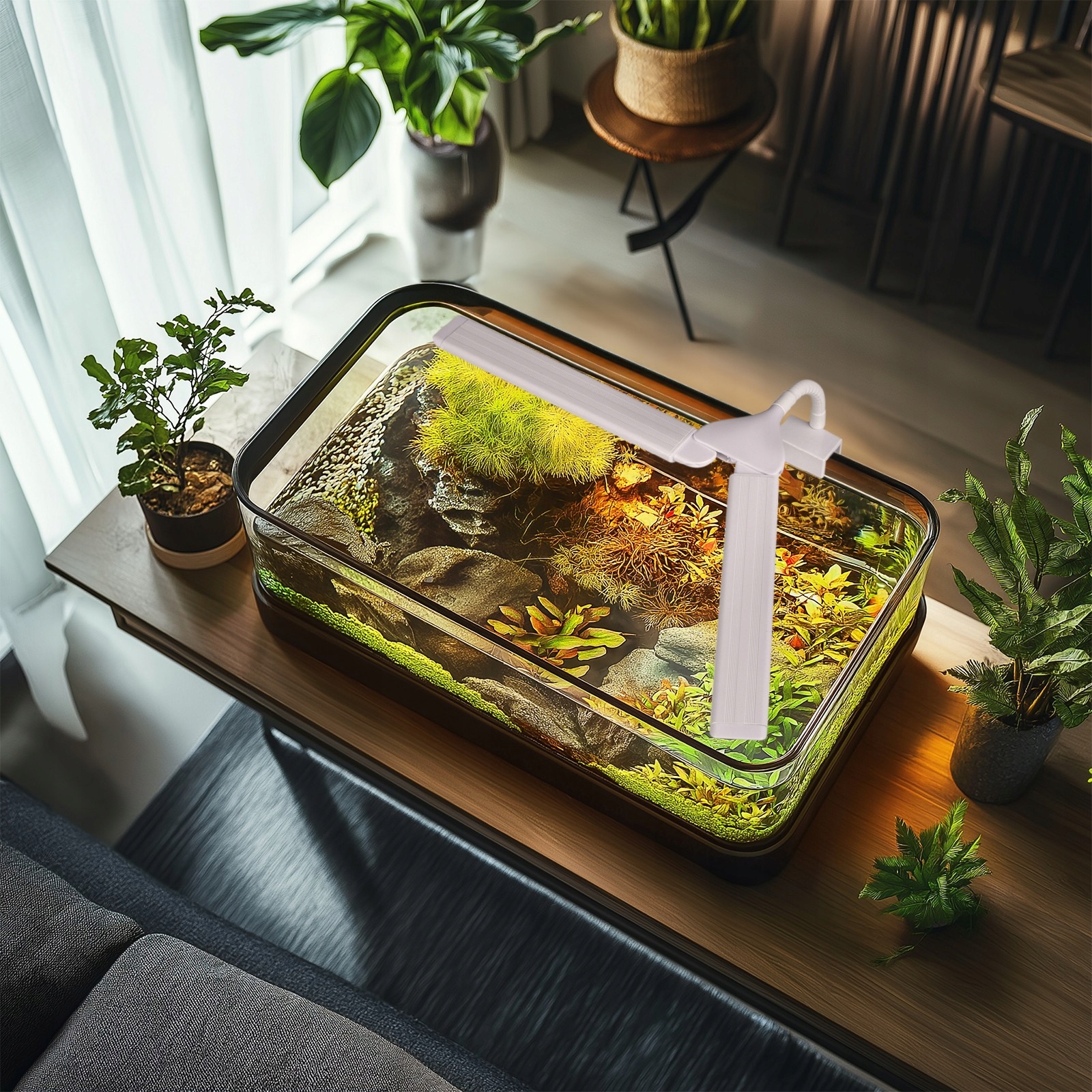 і все це в прекрасній, білої, мінімалістичній обстановці , і це виглядає чудово. кріпильні ручки на гвинті добре прилипають до краю акваріума, полиць або стільниці - без інструментів і без напруги.