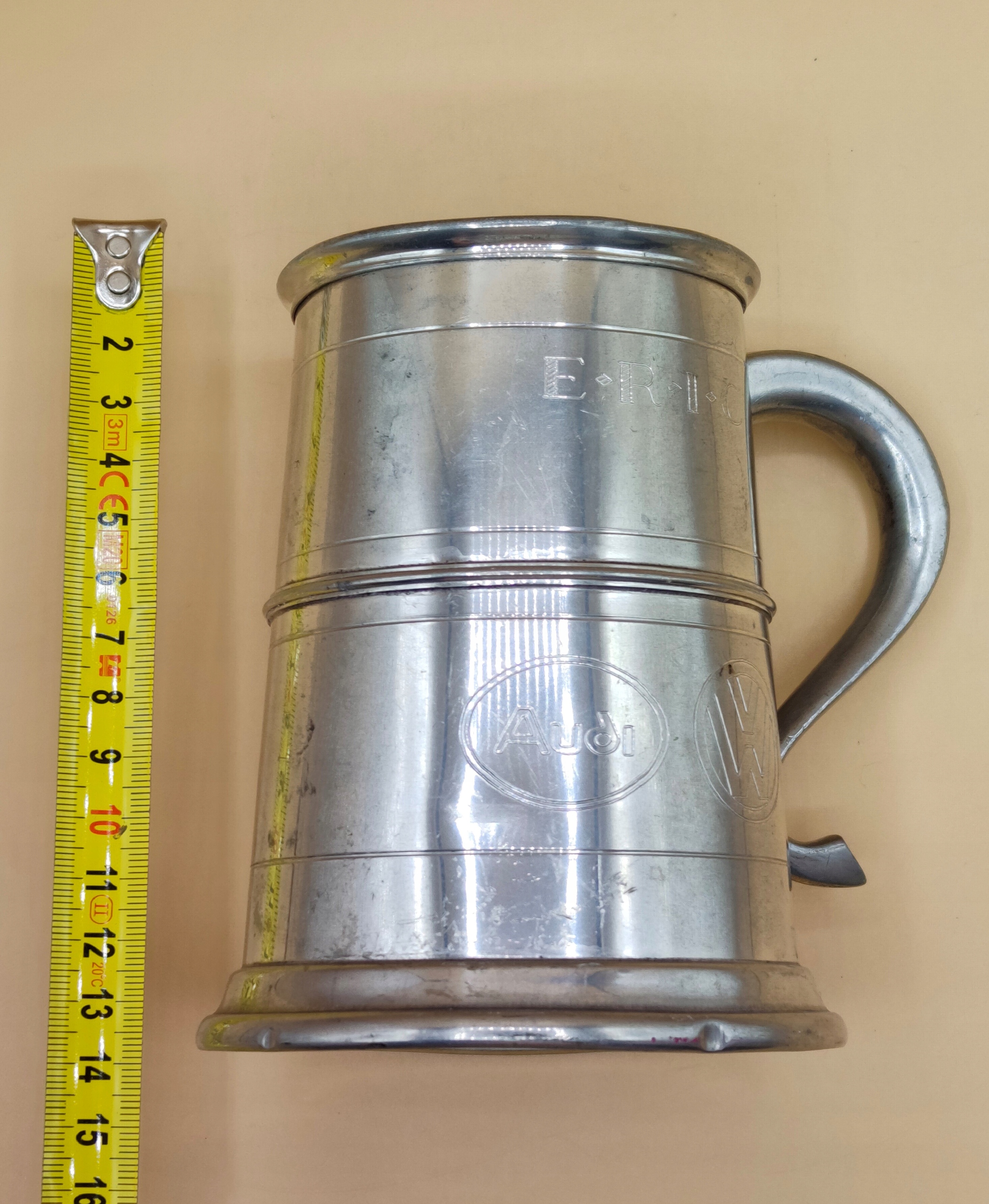 Жерстяна чашка. Старий предмет. Є сліди користування, подекуди невеликі вм'ятини та подряпини - але тріщин і зазубрин немає, нічого не ремонтували, просто старий предмет, звісно, він не протікає і з нього можна пити. Висота 13 см, ширина з ручкою 12,5 см, вага близько 300 грам, місткість 600 мл. Стара річ, стан як на фото, старовинна, колекційна. Рекомендую.