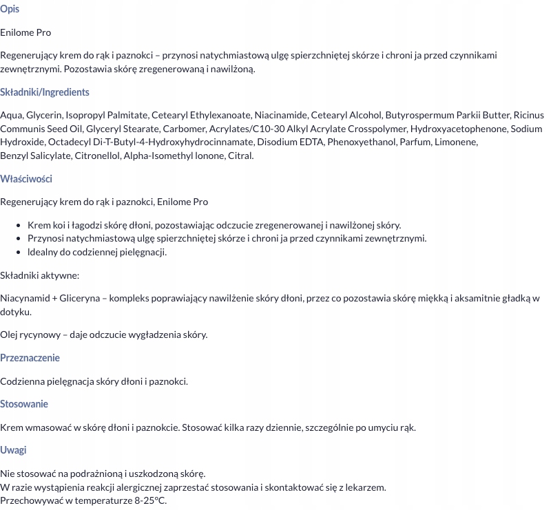 Просматривая «Enilome Pro, регенерирующая рука и крем для ногтей, 195 мл», вы можете быть уверены, что данный товар из каталога «[rubrica_name]» будет доставлен из Польши и проверен на целостность. В цене товара, указанной на сайте, учтена доставка из Польши. Внимание!!! Товары для Евросоюза, согласно законодательству стран Евросоюза, могут отличаться упаковкой или наполнением.