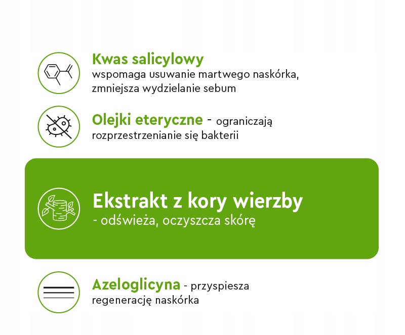 Аква, коко-глюкозид, полігліцерил-4 капрат, поліакрилатний кросполімер-6, кокоат сахарози, бензиловий спирт, кокамідопропілбетаїн, кокоілгліцинат натрію, гідрогенізований жожоба Олія, азелоїл дигліцинат калію, олія листя Melaleuca Alternifolia, олія листя Mentha Arvensis, 4-терпінеол, екстракт кори Salix Alba, токоферол, саліцилова кислота, дегідрооцтова кислота, лимонна кислота, бензойна кислота, бензоат натрію, хлорид натрію, метилпропандіол, сорбат калію, t-бутиловий спирт, CI 77289.