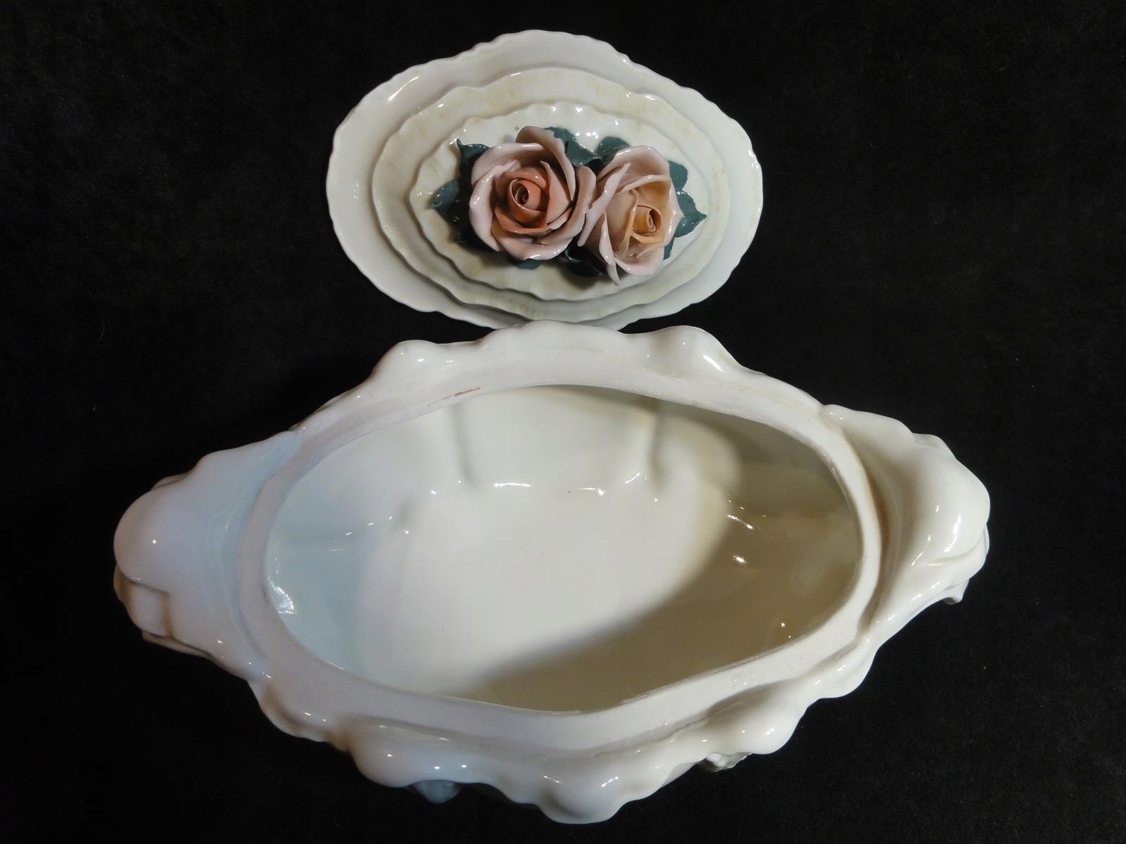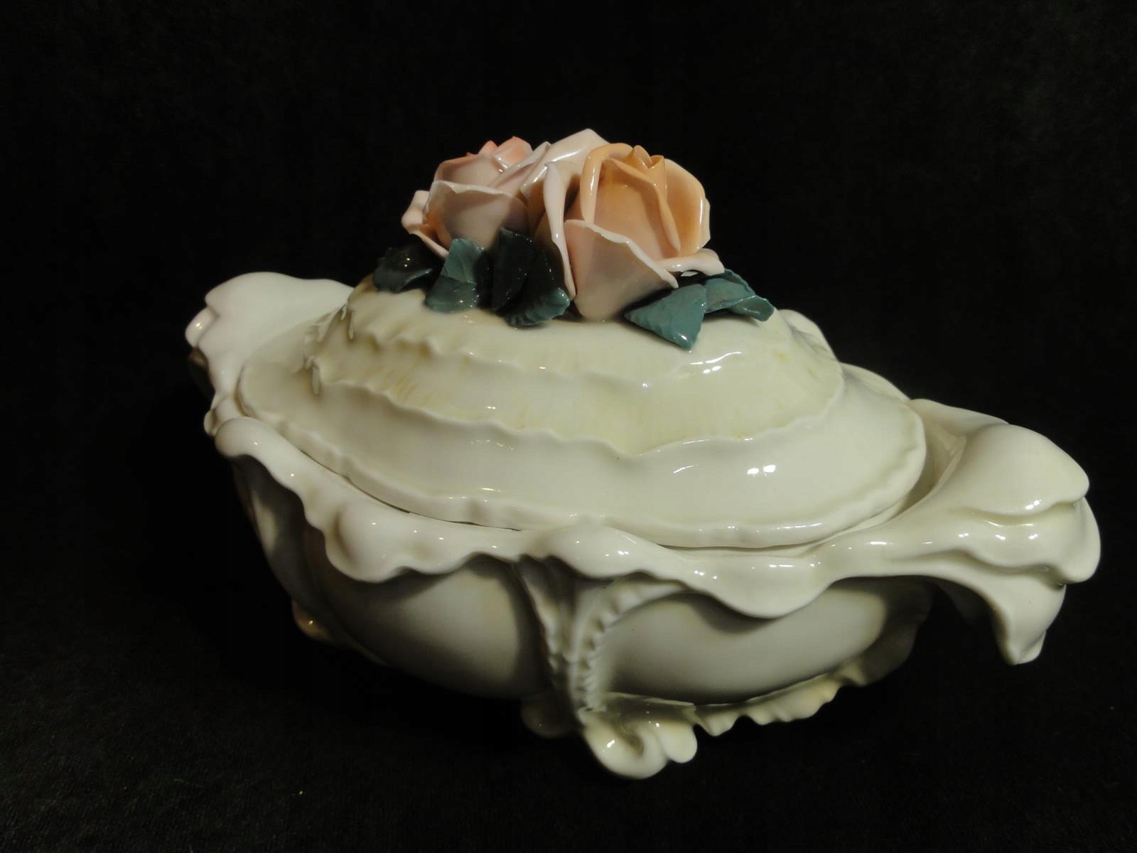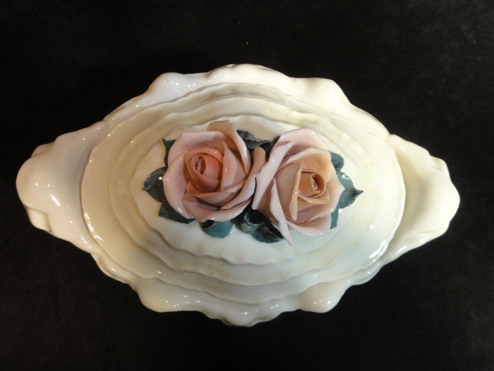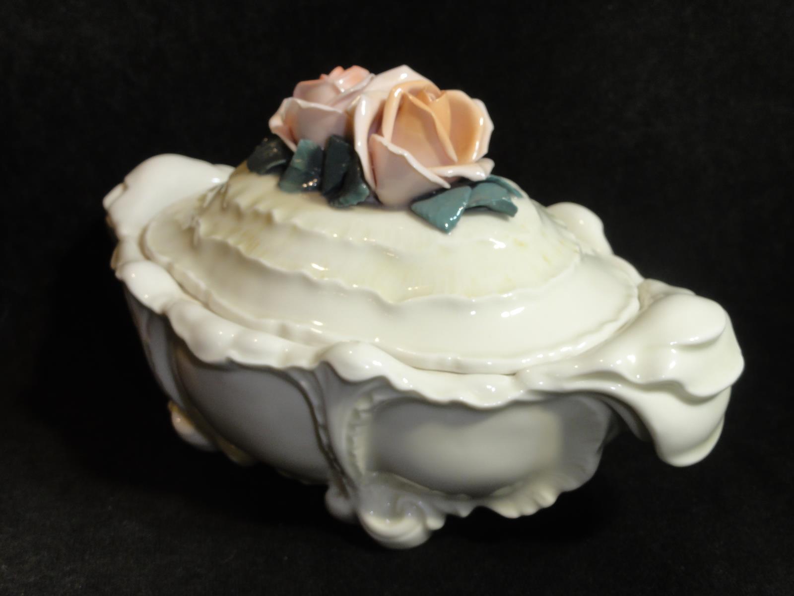 *з порцеляни кольору екрю, витончених форм, з трояндами кришка,