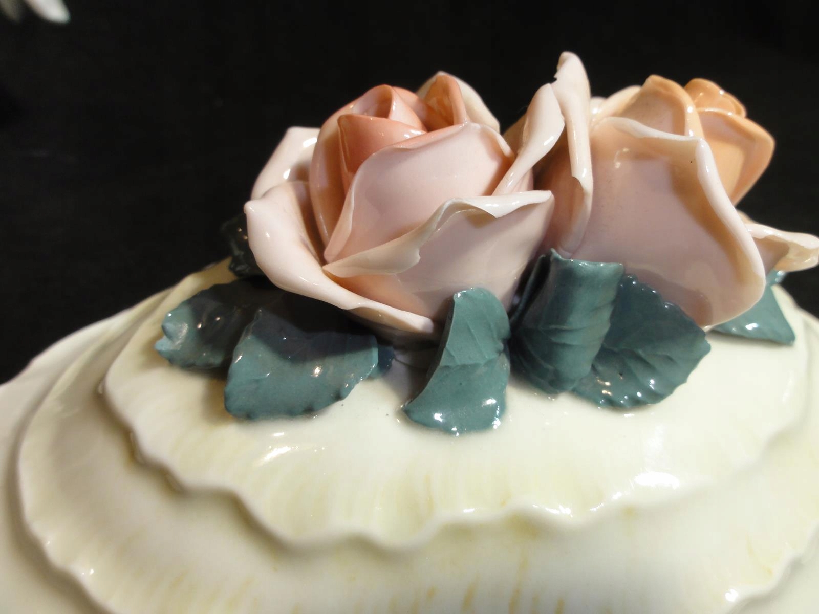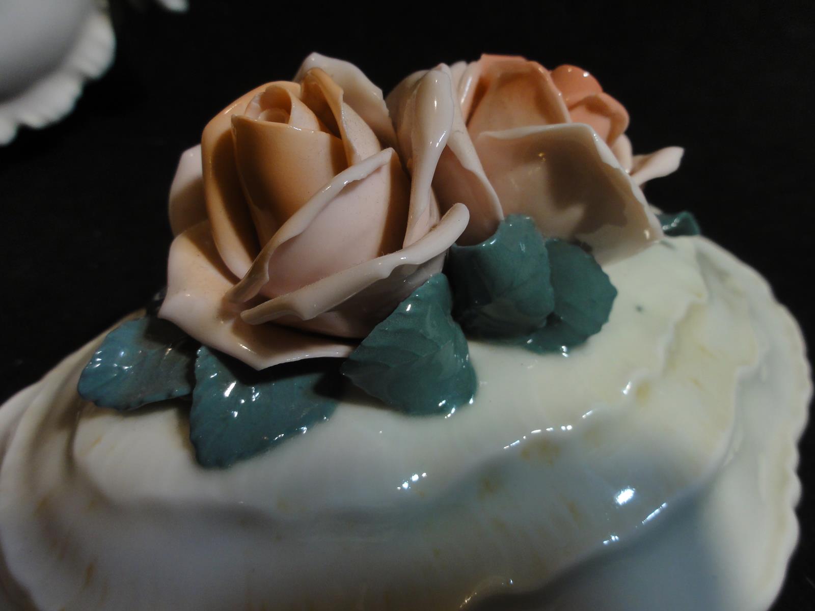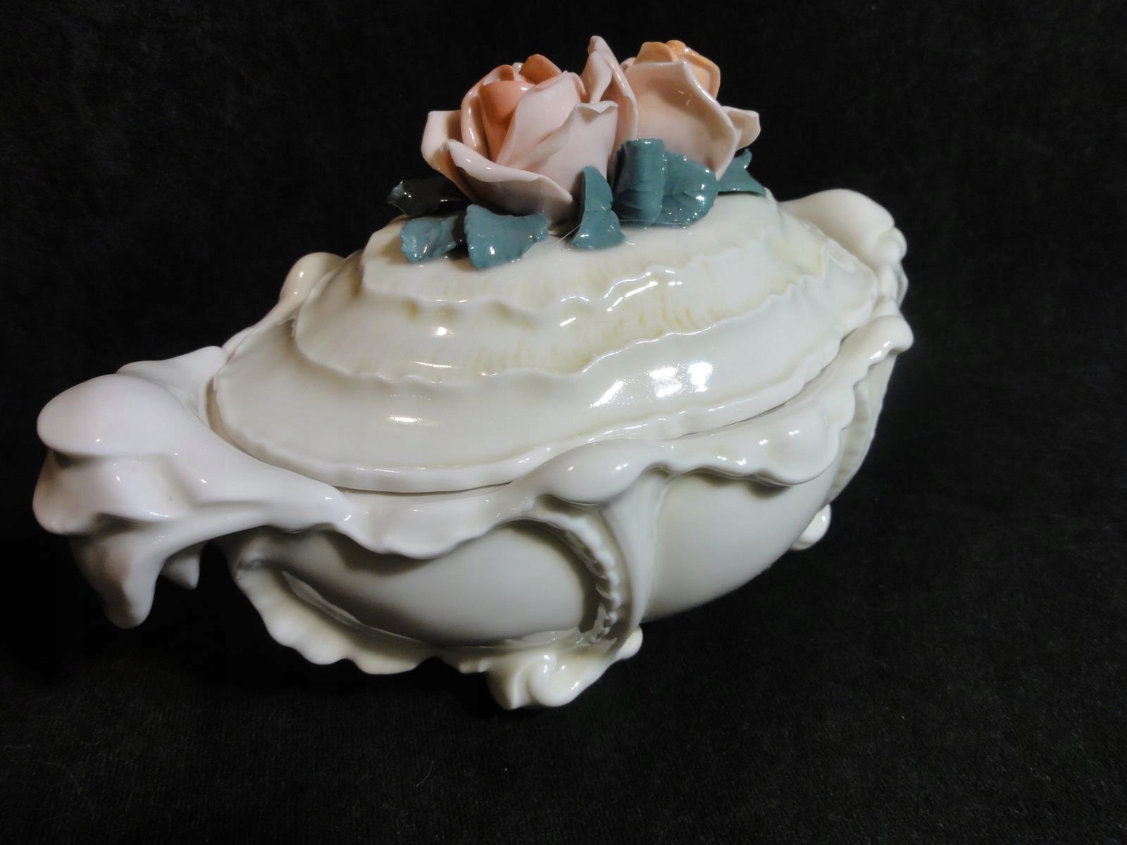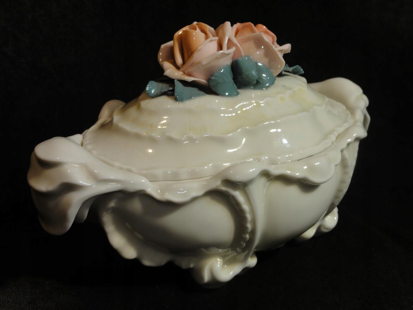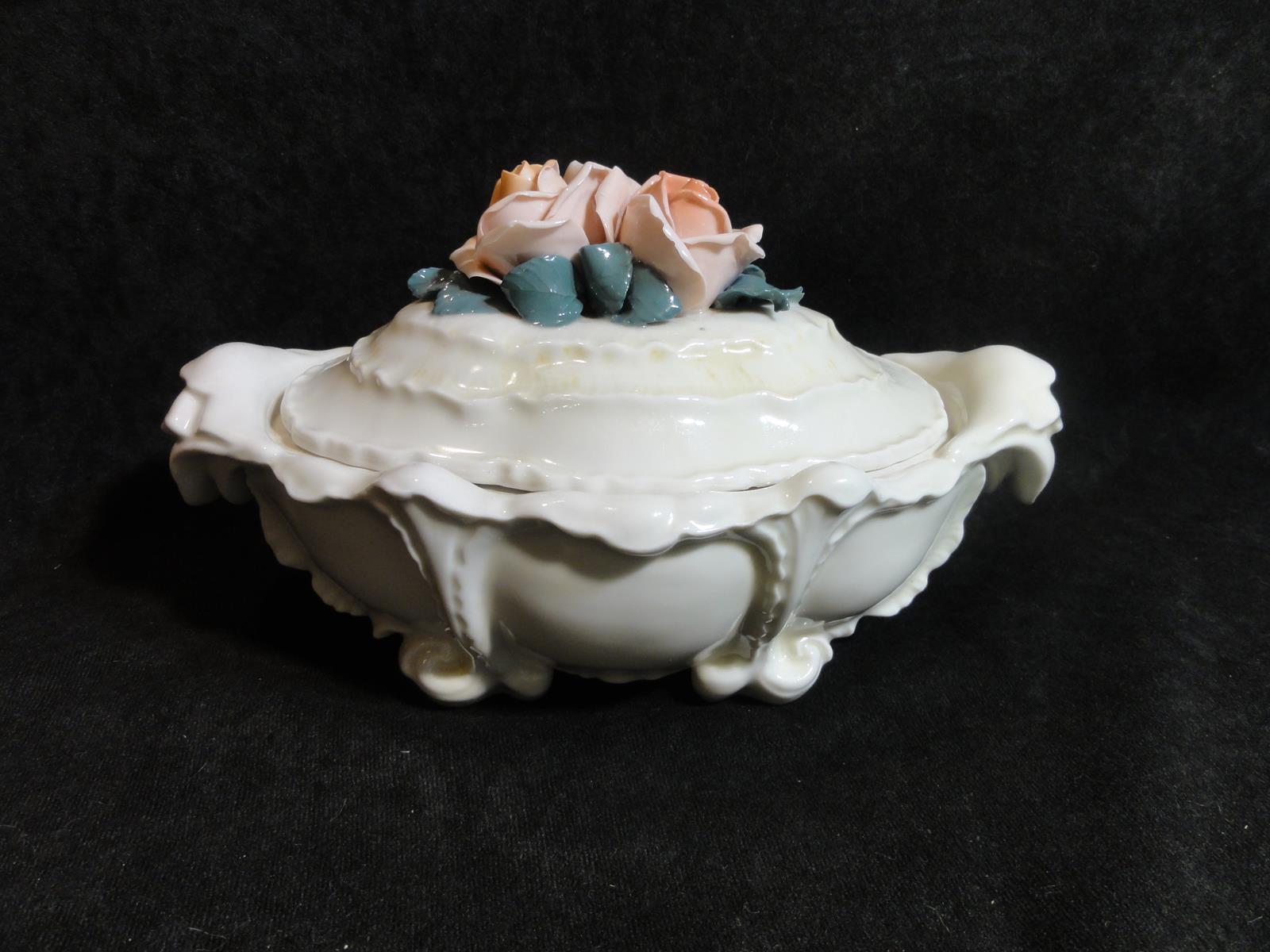 *з порцеляни кольору екрю, витончених форм, з трояндами кришка,