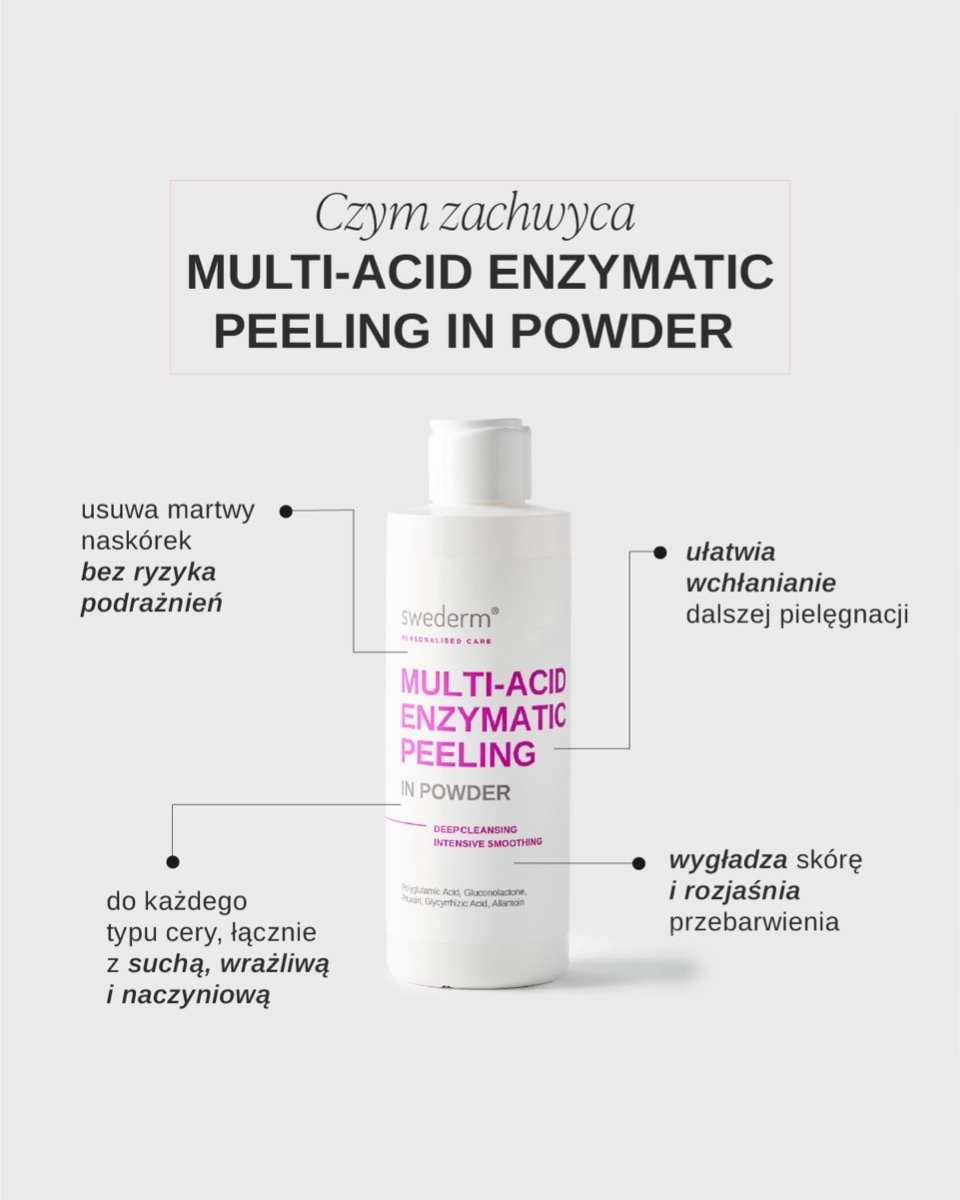 Мультикислотний ензимний пілінг в порошку - унікальний відлущувальний препарат, призначений для всіх типів шкіри, включаючи суху, чутливу та судинну. Він активується у поєднанні з водою, викликаючи дію папаїну та кислот.