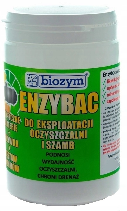 Enzybac - ідеальний продукт для всіх типів побутових очисних споруд, як традиційних, однокамерних, так і більш технологічних очисних споруд - з біологічним осадом або активним мулом. Препарат підходить як для пуску очисних споруд, так і для їх тривалої експлуатації. Для старту не потрібно купувати спеціальний біопрепарат. Enzybac складається в основному з бактерій та іммобілізованих ферментів, які значно прискорюють процеси біохімічного розкладання в стічних водах. Ферменти і бактерії, що містяться в препараті, розщеплюють складні органічні сполуки стічних вод (вуглеводи, білки, жири) до простих сполук: вуглекислого газу, води і сполук азоту. Регулярне використання Enzybac на практиці означає безперебійну роботу очисних споруд або септиків, без неприємних запахів. Робота очисних споруд підтримується на максимальній потужності.
