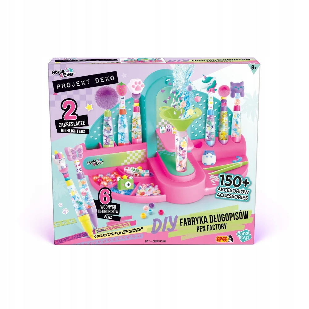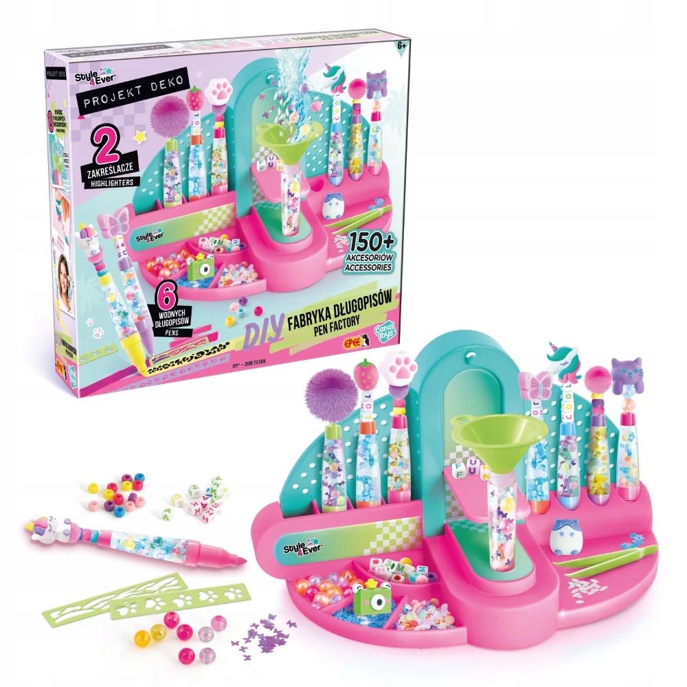 Pen Factory — це набір, який дозволяє створювати та прикрашати ручки та маркери самостійно! Всередині ви знайдете все необхідне для їх створення - намистини, фігурки та багато інших аксесуарів!